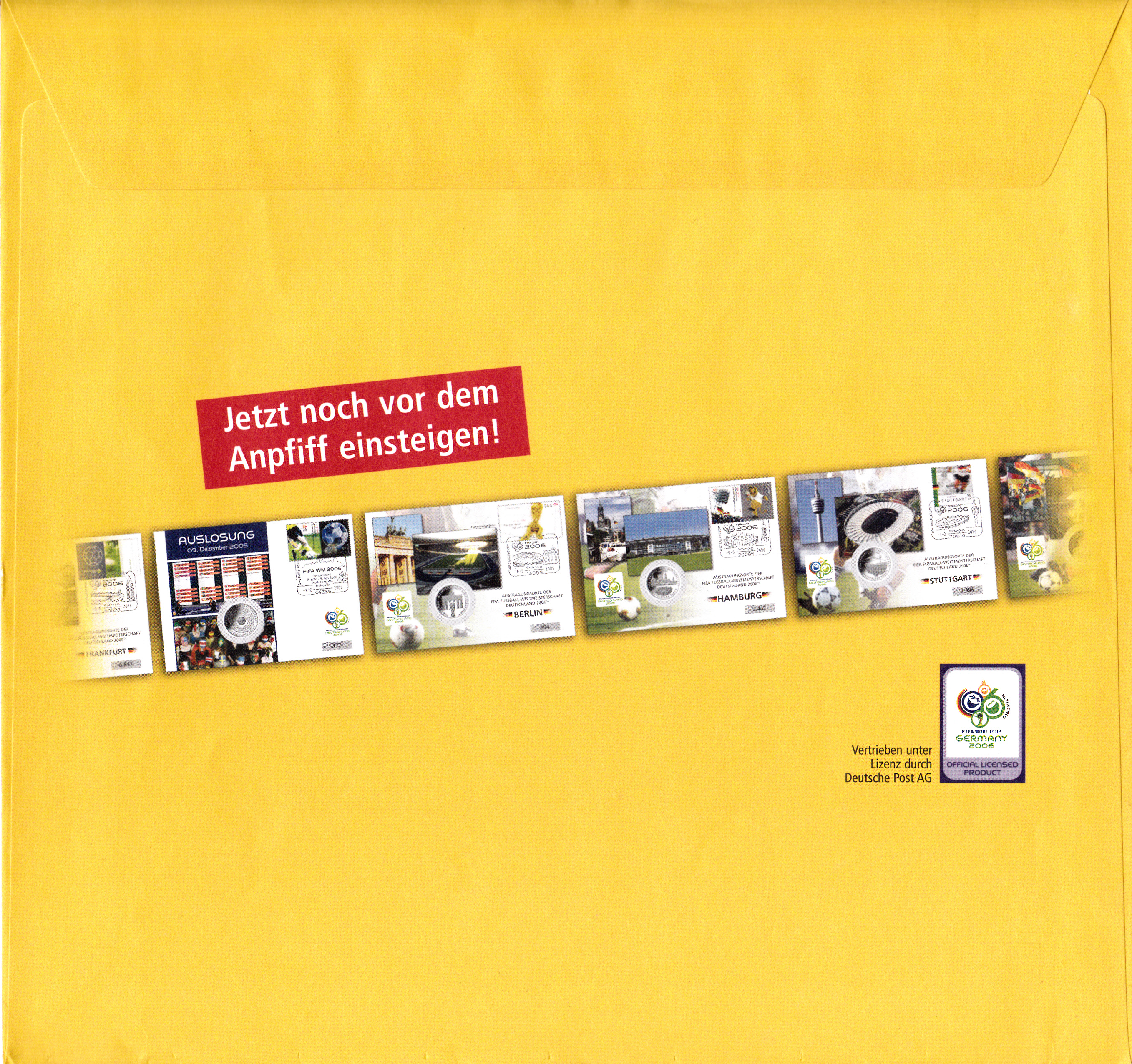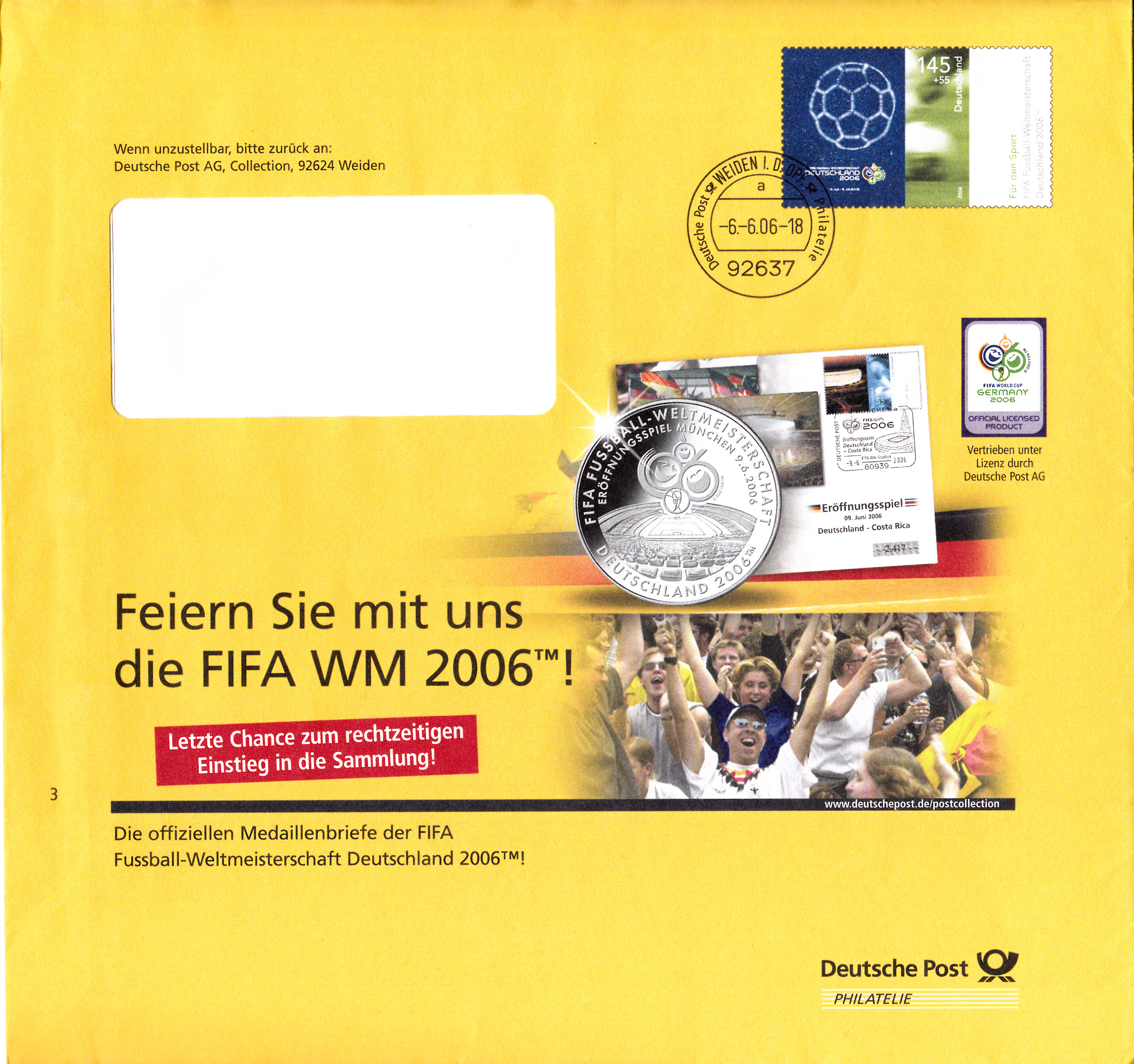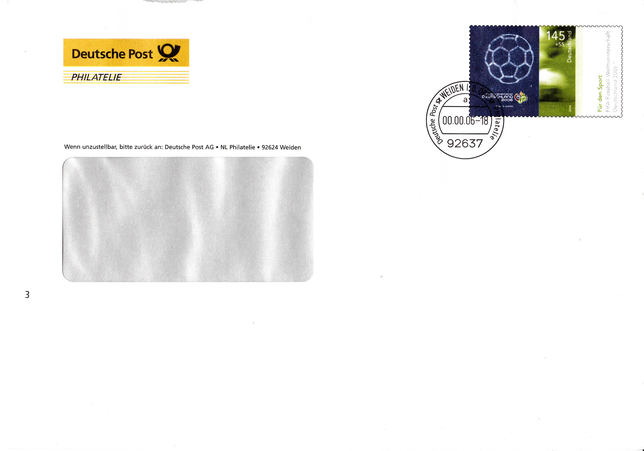 Die Marke zu 145+55 Cent der Sporthilfemarken 2006 (MiNr 2521) wurde auch als Wertstempel auf diesem Umschlag bei den Eigenausgaben der Deutschen Post AG mit Postlogo "Deutsche Post / PHILATELIE" benutzt (MiNr EA F148). Diese Ausgabe passt somit auch in eine Sammlung zur Fußball-WM 2006.
