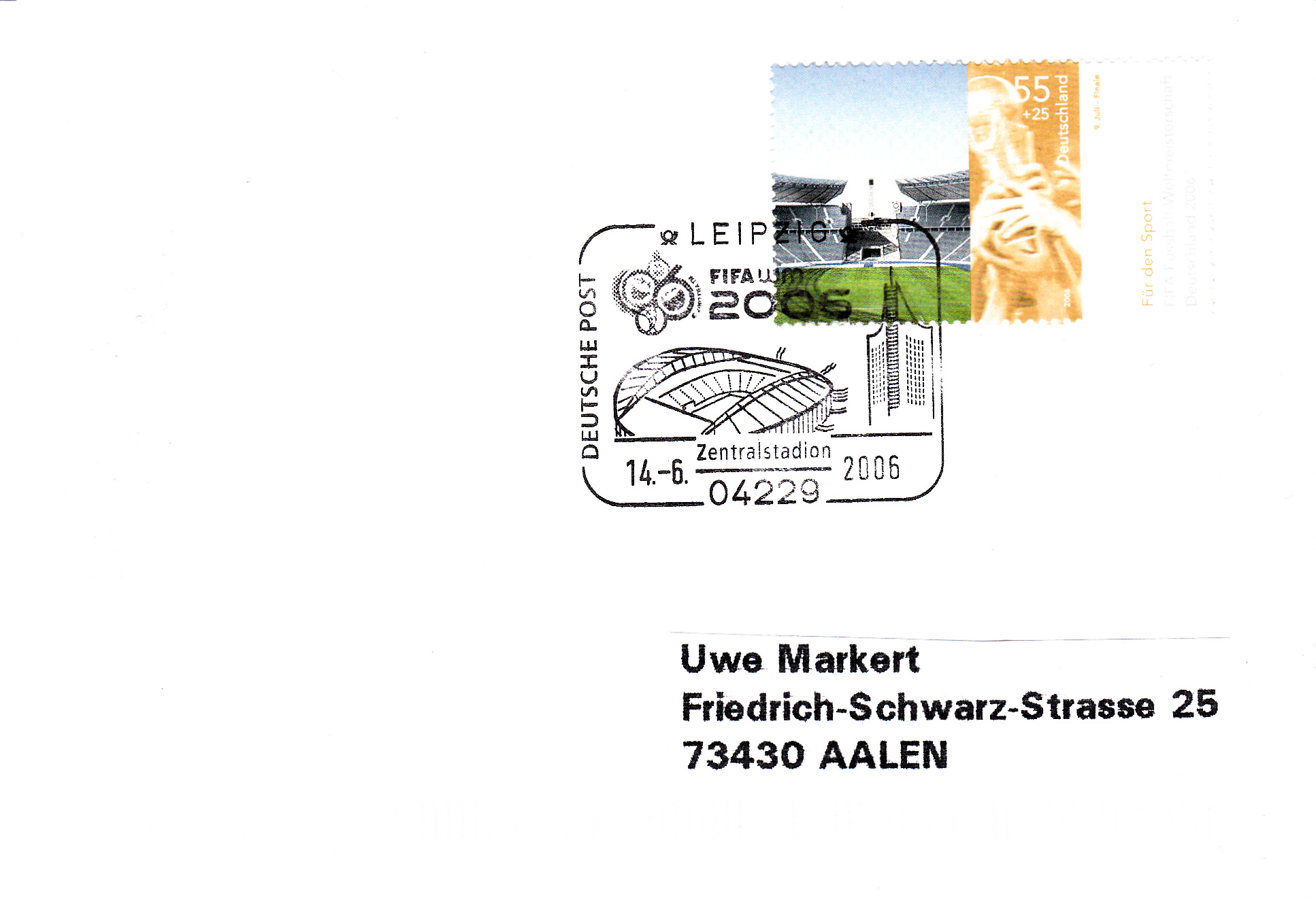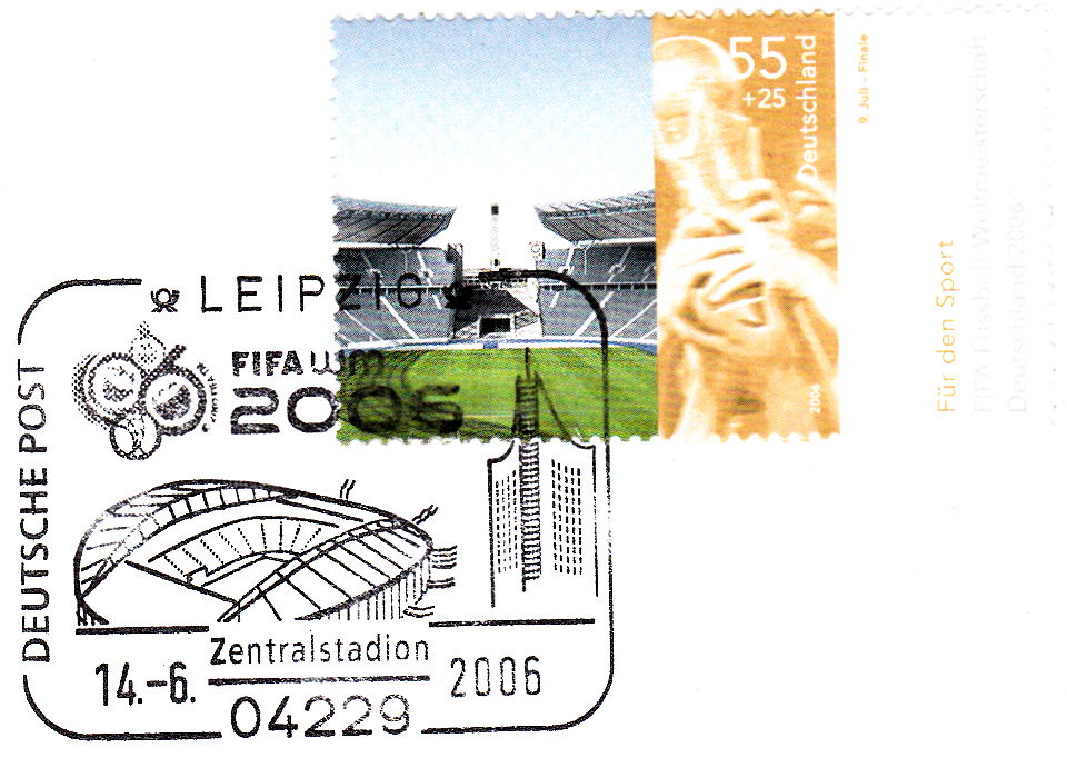 Sonderstempel vom 14.6.2006 aus Leipzig zur Fußball-WM 2006. Im Stempelbild wird das Zentralstadion gezeigt, in dem am 14.6.2006 das Spiel Spanien - Ukraine 4:0 stattfand.