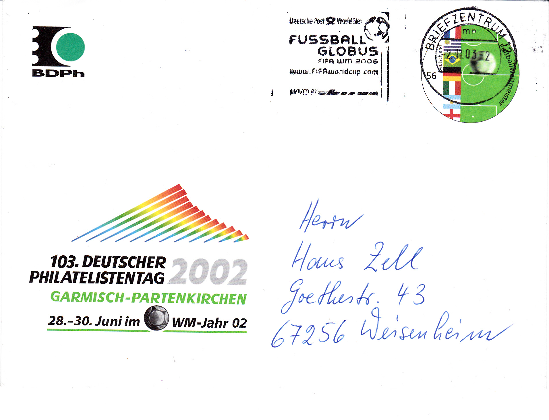 Zum Deutschen Philatelistentag in Garmisch-Partenkirchen ist ein Sonderumschlag (MiNr USo 37) mit dem Wertstempel Fußballweltmeister im 20. Jahrhundert (MiNr 2258) erschienen.