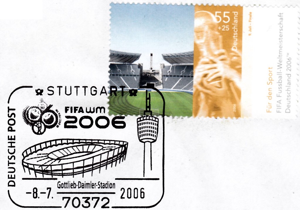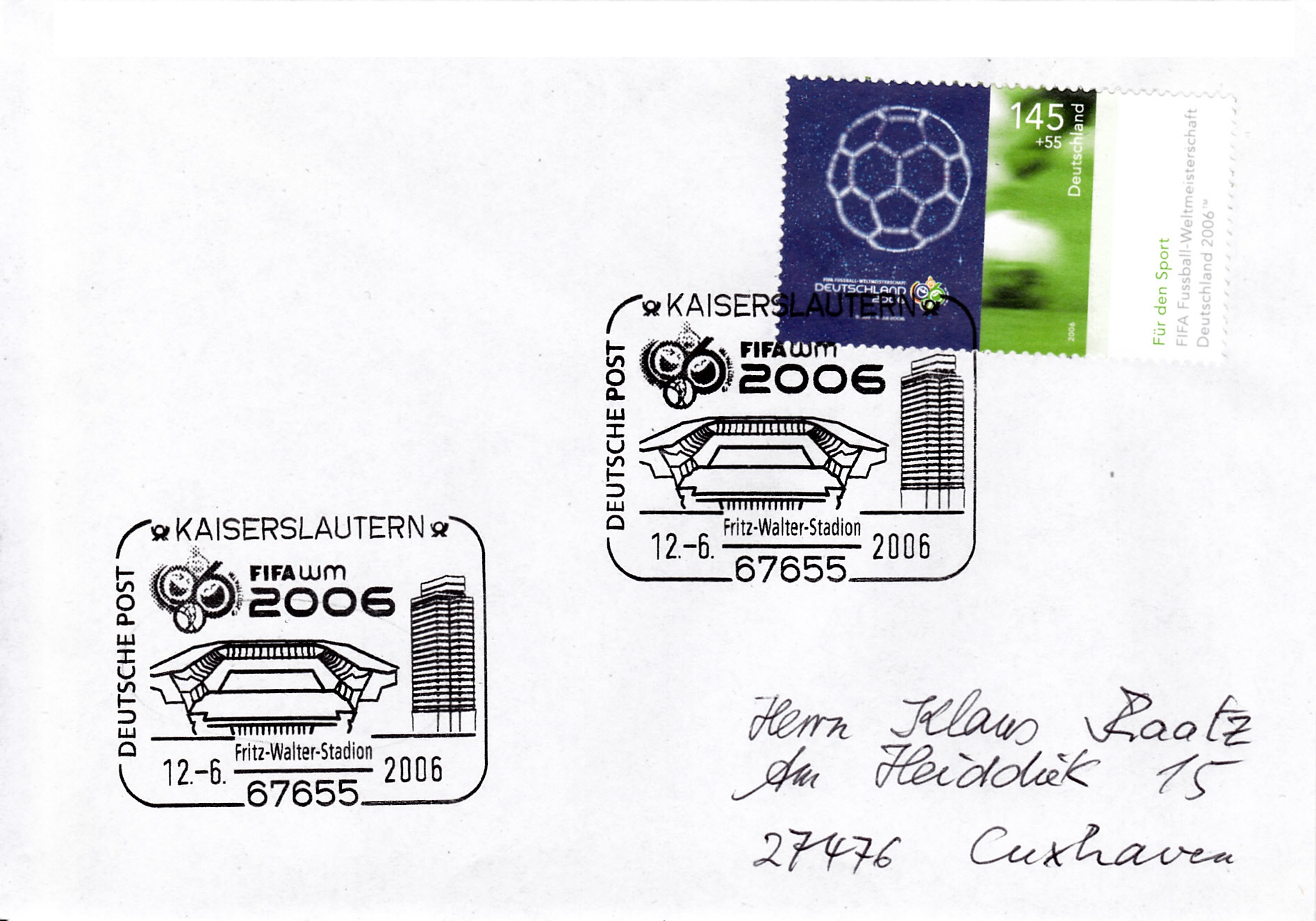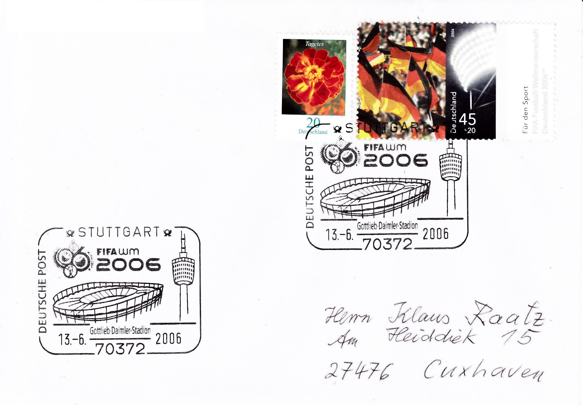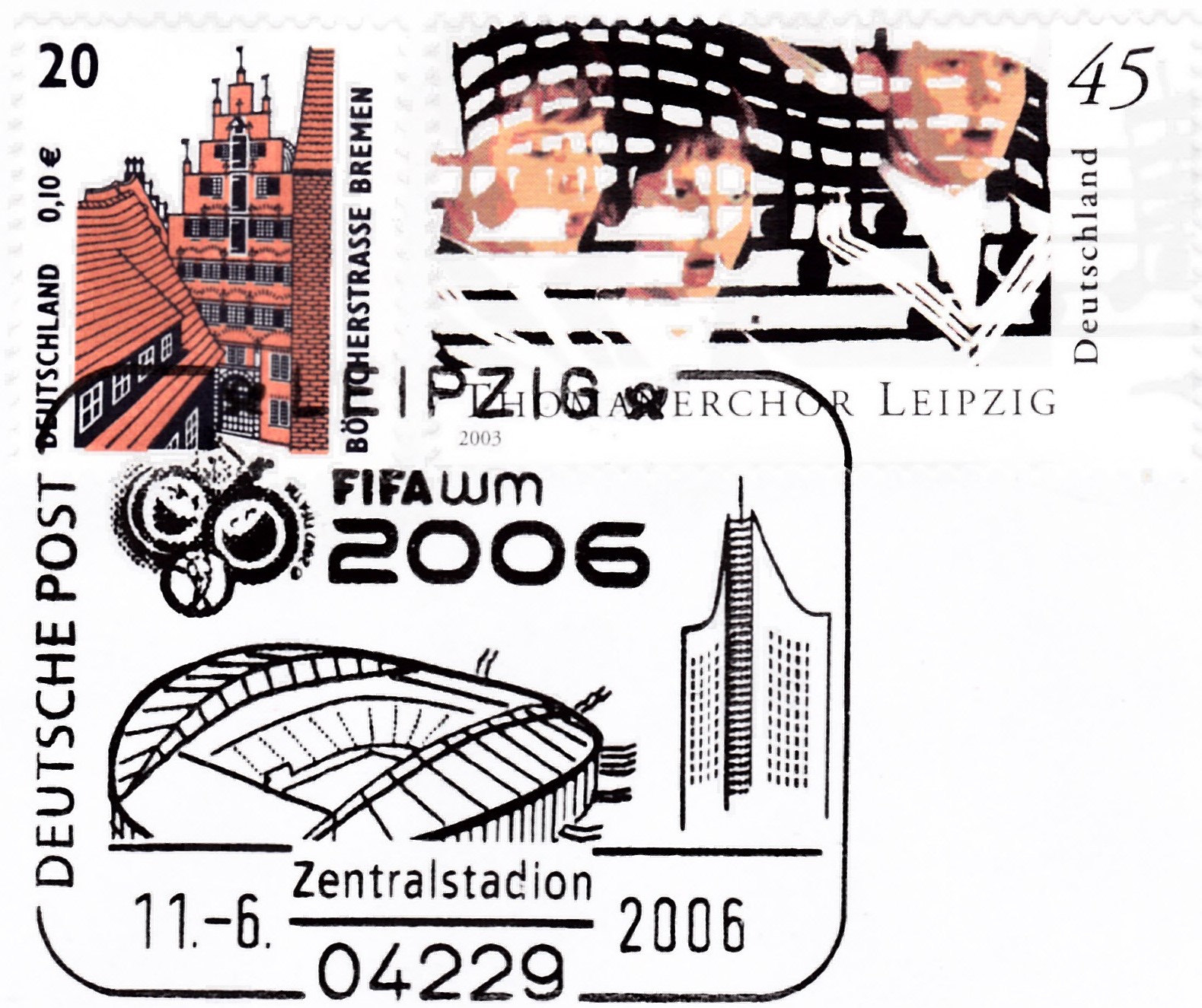 Gelaufener Brief mit dem Sonderstempel vom 11.6.2006 aus Leipzig. Er dokumentiert das Spiel Serbien und Montenegro – Niederlande und zeigt das FIFA WM-Stadion Leipzig (das Heimatstadion von RB Leipzig, Red Bull Arena, bis 30. Juni 2010 offiziell und im Sprachgebrauch auch heute noch Zentralstadion).