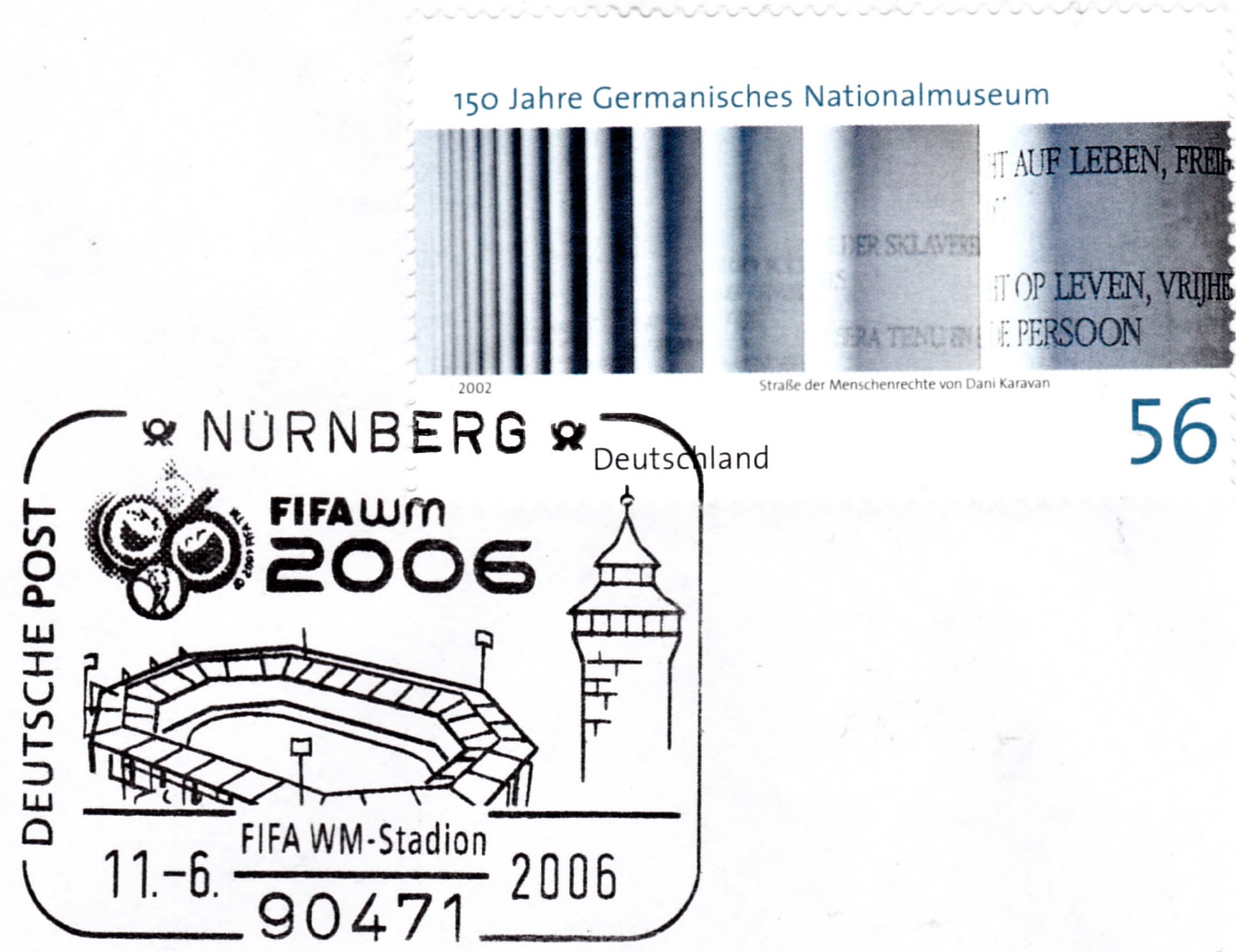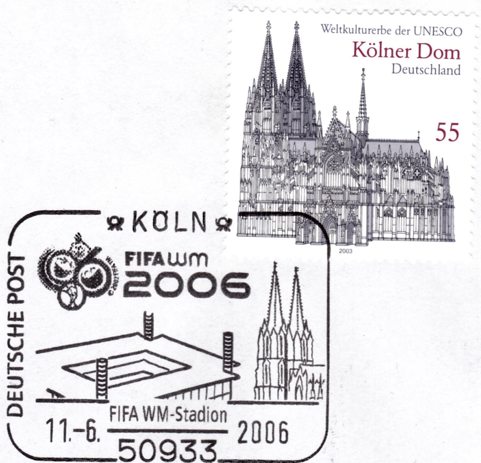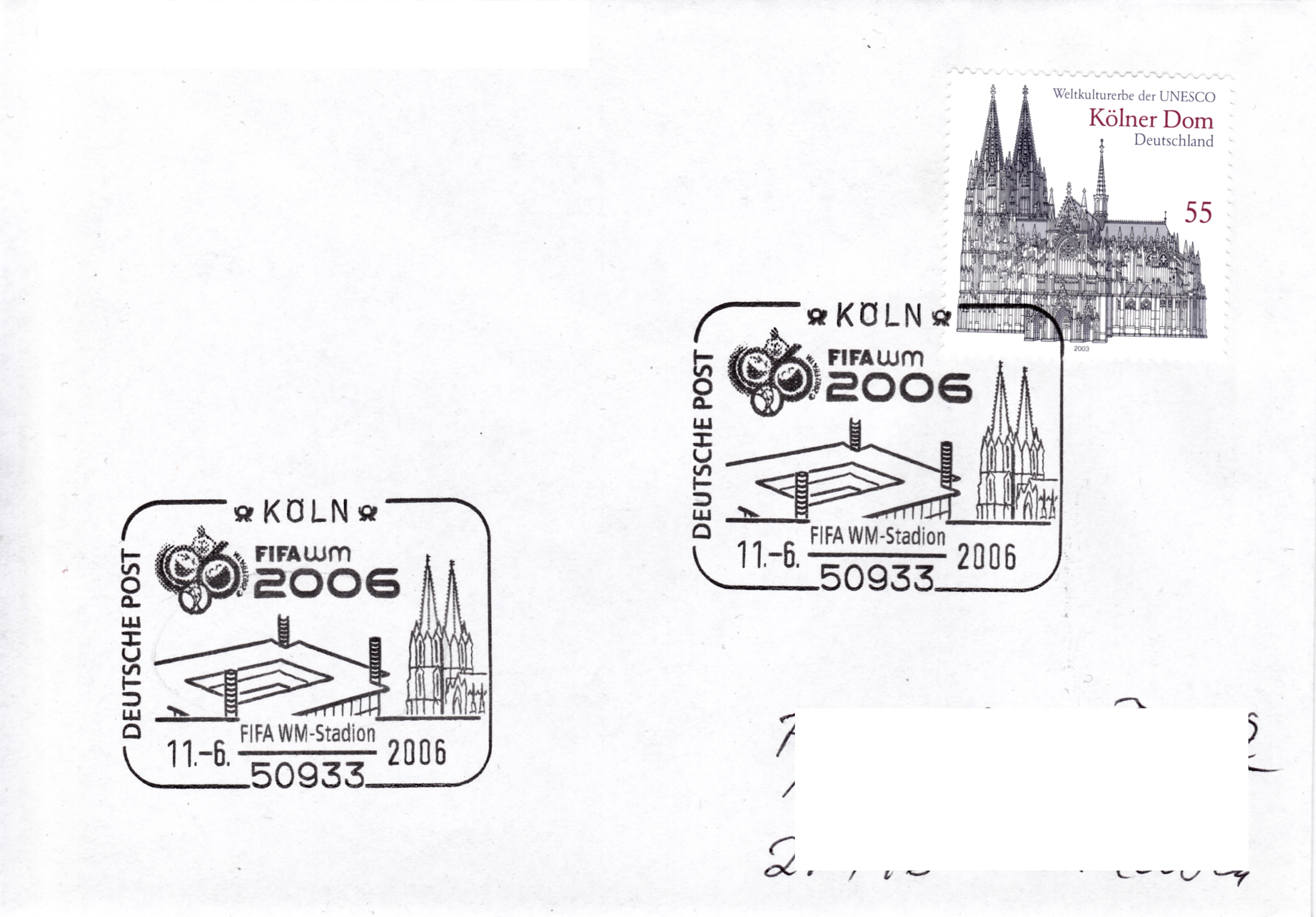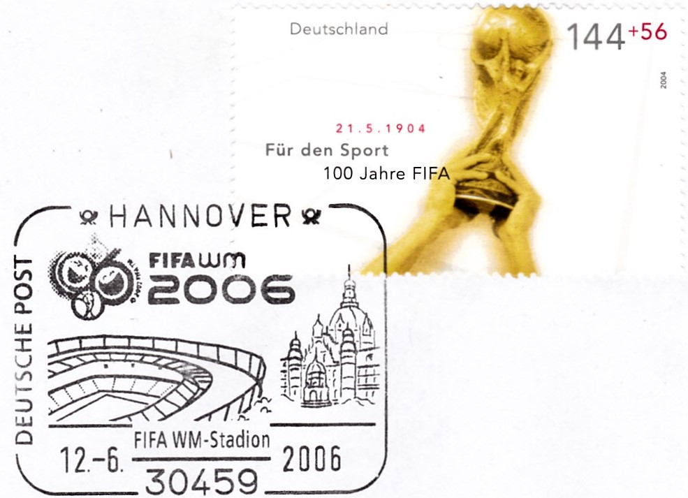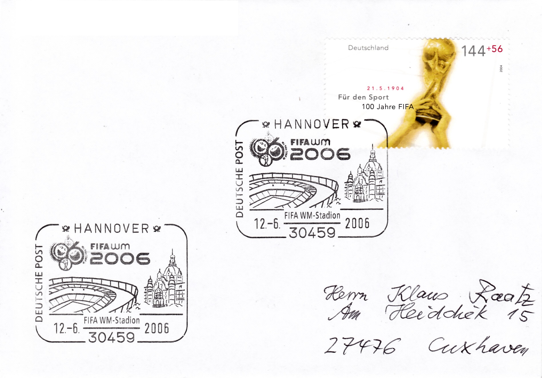 Gelaufener Brief mit dem Sonderstempel vom 11.6.2006 aus Leipzig. Er dokumentiert das Spiel Serbien und Montenegro – Niederlande und zeigt das FIFA WM-Stadion Leipzig (das Heimatstadion von RB Leipzig, Red Bull Arena, bis 30. Juni 2010 offiziell und im Sprachgebrauch auch heute noch Zentralstadion).