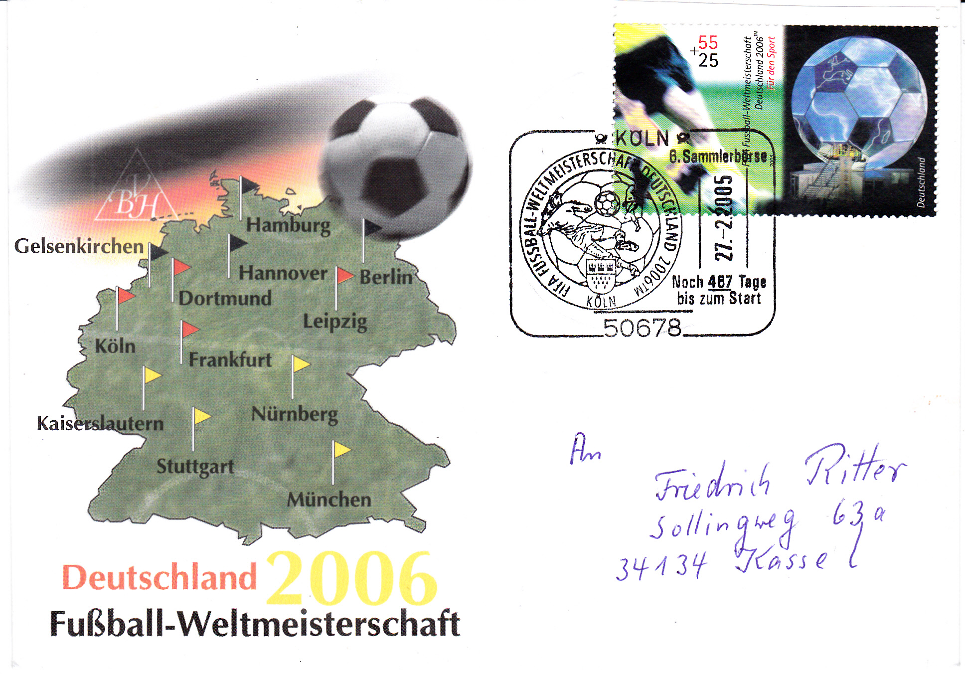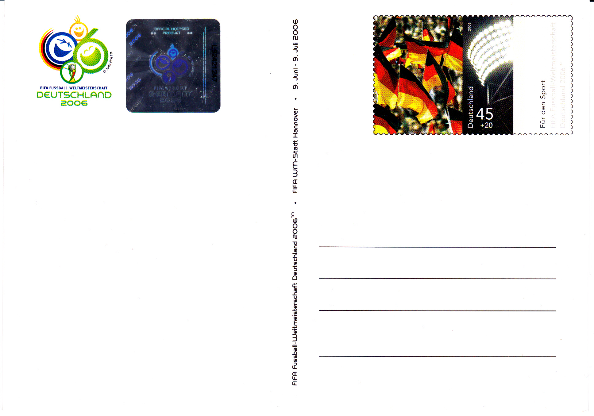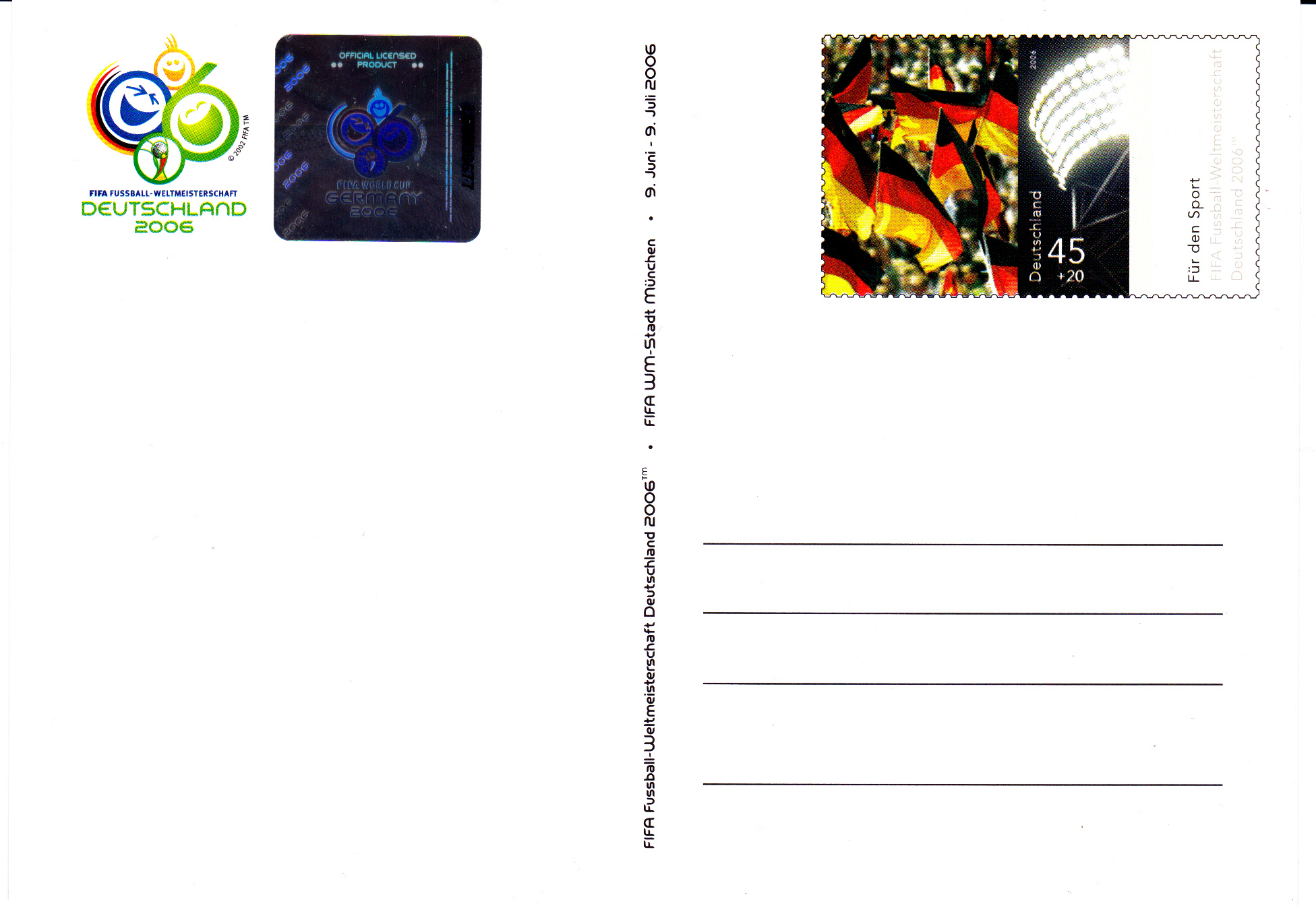 Hier zeige ich eine Ganzsache (MiNr PSo 92 II/10) mit Hologramm oben links und mit dem Wertstempel der Sportzuschlagsmarke MiNr 2517. In der Textzeile, die das Anschriftenfeld begrenzt, ist ein Hinweis auf die "FIFA WM-Stadt München".