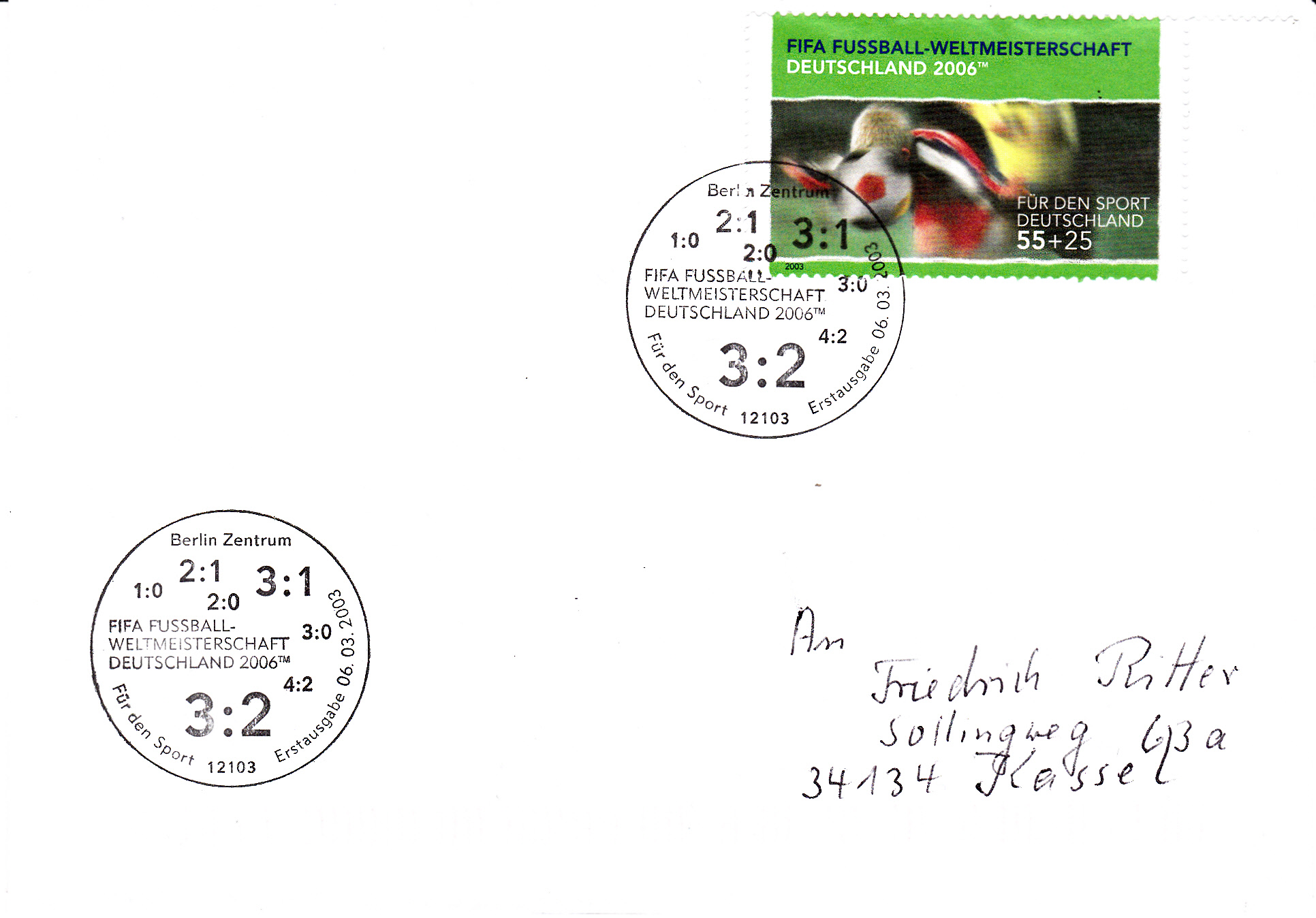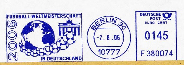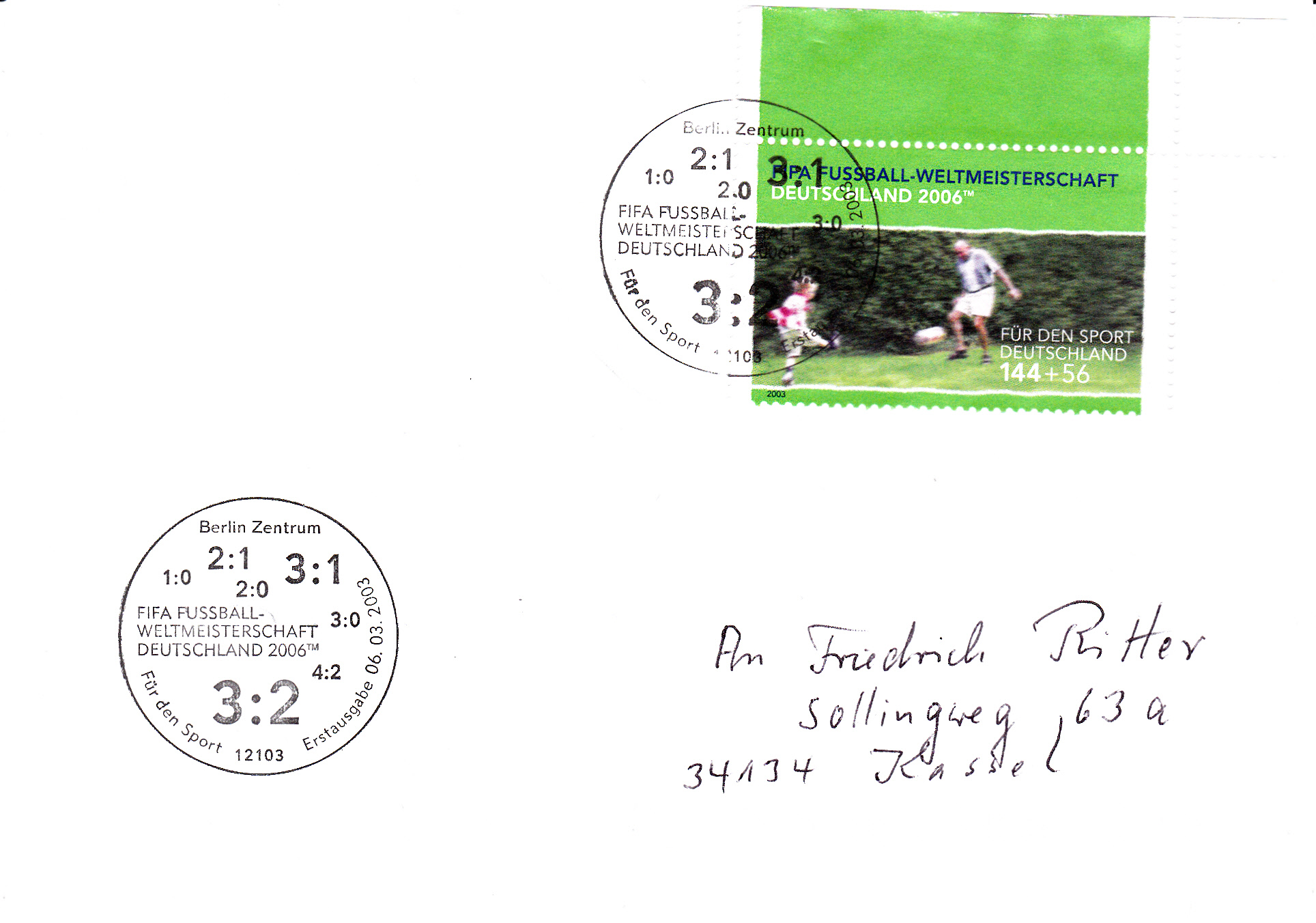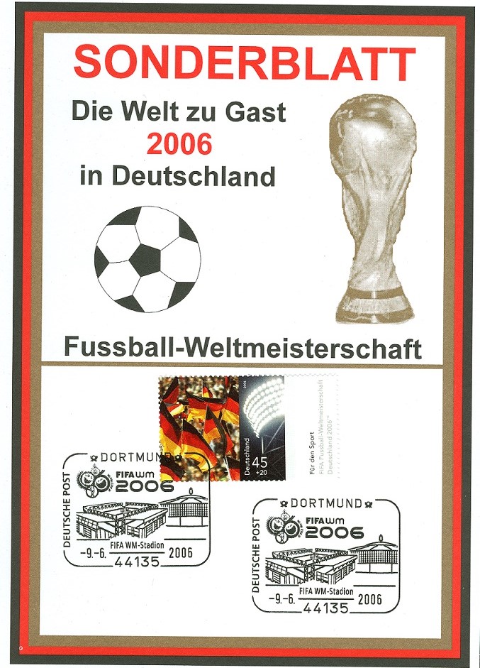 Hier zeige ich eine Ganzsache (MiNr PSo 92 II/10) mit Hologramm oben links und mit dem Wertstempel der Sportzuschlagsmarke MiNr 2517. In der Textzeile, die das Anschriftenfeld begrenzt, ist ein Hinweis auf die "FIFA WM-Stadt München".