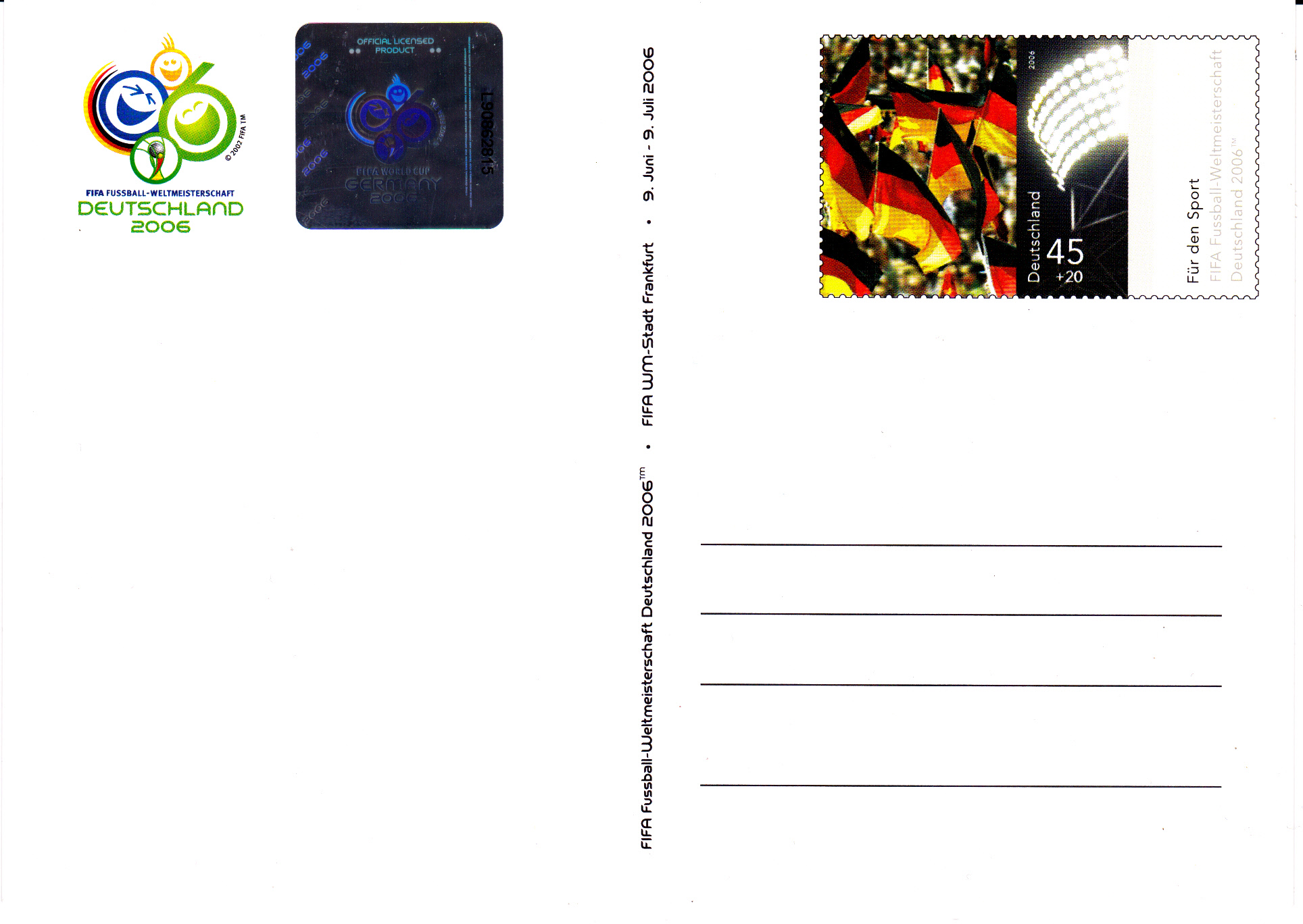 Die Ganzsachen gibt es auch ohne die links oben aufgeklebten Hologramme. Die Karten ohne Hologramme wurden als kompletter Satz in einer Folienverpackung zu 9.--€ nur durch die Postphilatelie, die Karten mit den Hologrammen nur als Einzelkarte (zu je 1.-- €) durch die "Erlebnis-Briefmarken-Teams" in den Austragungsorten sowie beim "Philatelie-Truck" der Deutschen Post AG verkauft.