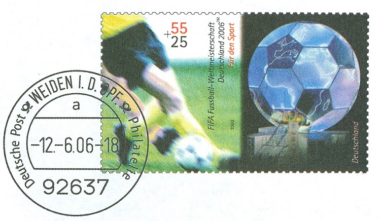 Wertstempel mit Fußball-Motiven sind nicht sooo häufig. Auf der Eigenausgabe F 144 der DP AG aus dem jahr 2006 ist ein Fußball-Motiv zu finden. Der Wertstempel entspricht motivlich der Bundmarke MiNr. 2440.