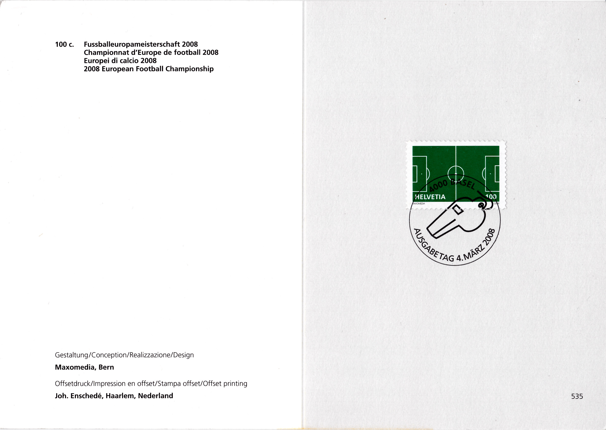 In der Schweiz ist zu den Europameisterschaften 2008 diese Marke (MiNr 2044) mit der Abbildung eines Fußballspielfeldes erschienen. Hier wurde die Marke mit dem Ersttagsonderstempel gestempelt.