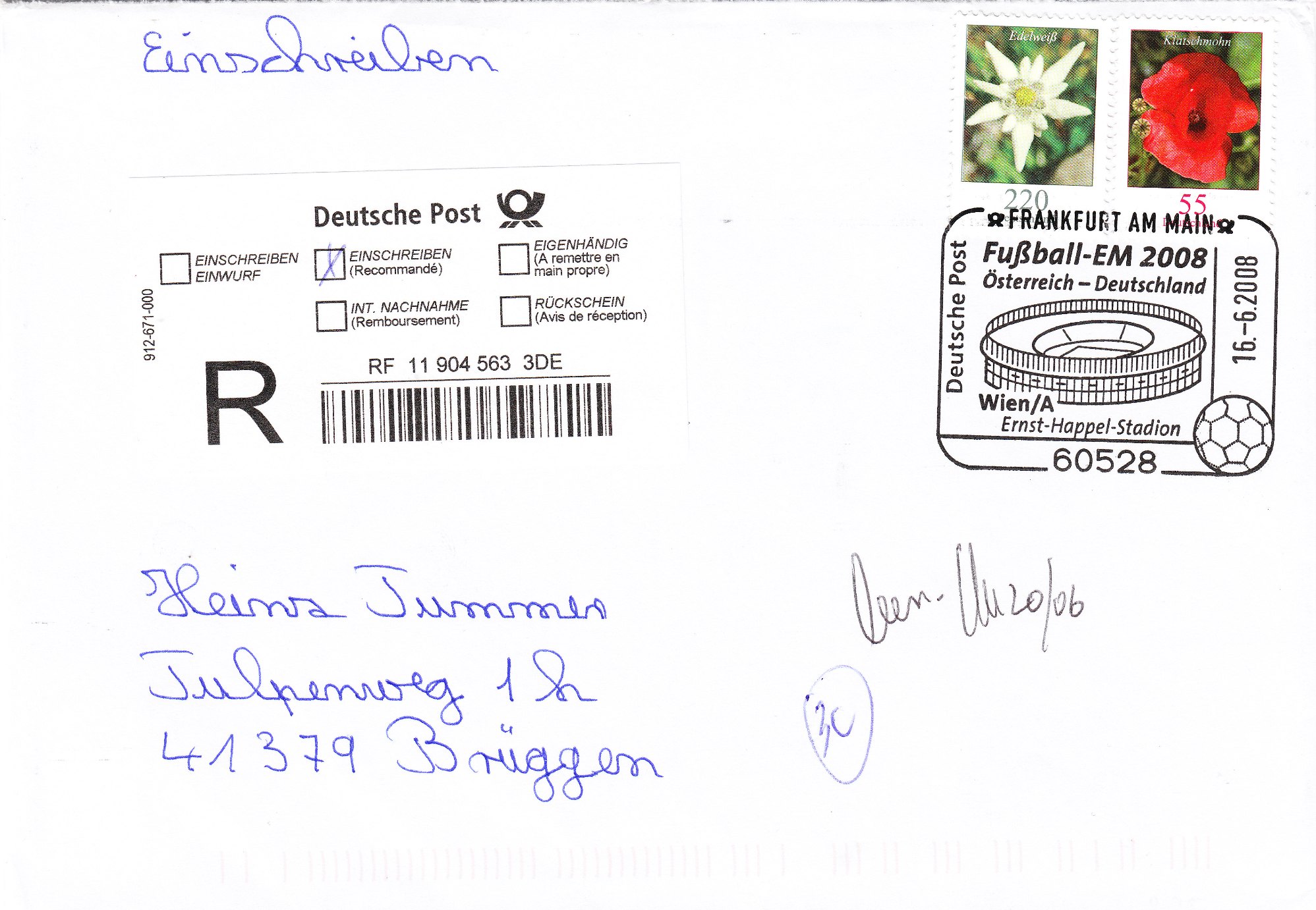 Dieser Sonderstempel aus Frankfurt dokumentiert dieses sportliche Ereignis auf der zur EM 2008 in Deutschland erschienenen Zuschlagsmarke: