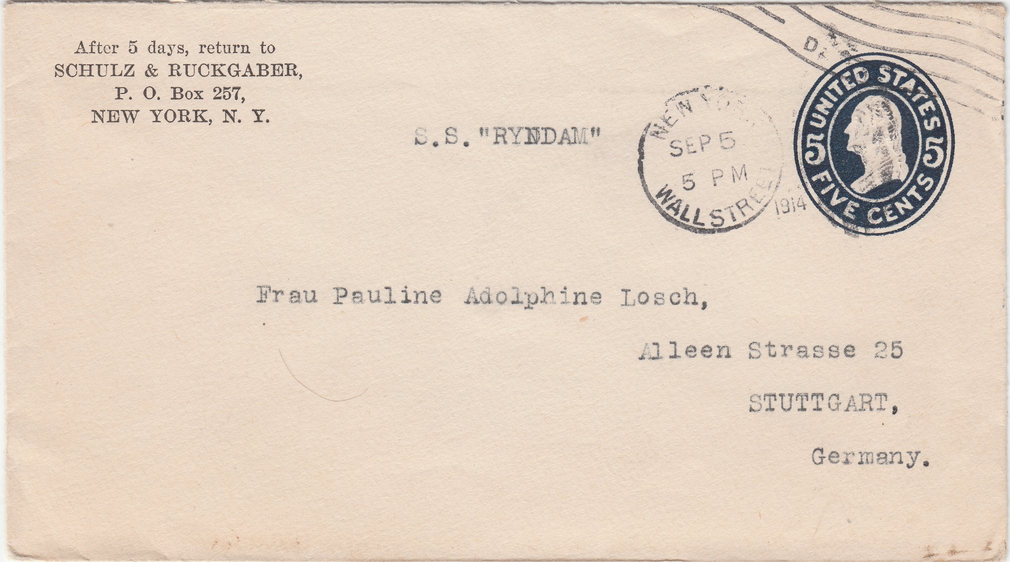 Diese Ganzsache mit Eindruck "SCHULZ & RUCKGABER" wurde nach Deutschland adressiert am 05.09.1914 in New York an der berühmten WALL STREET aufgegeben:
