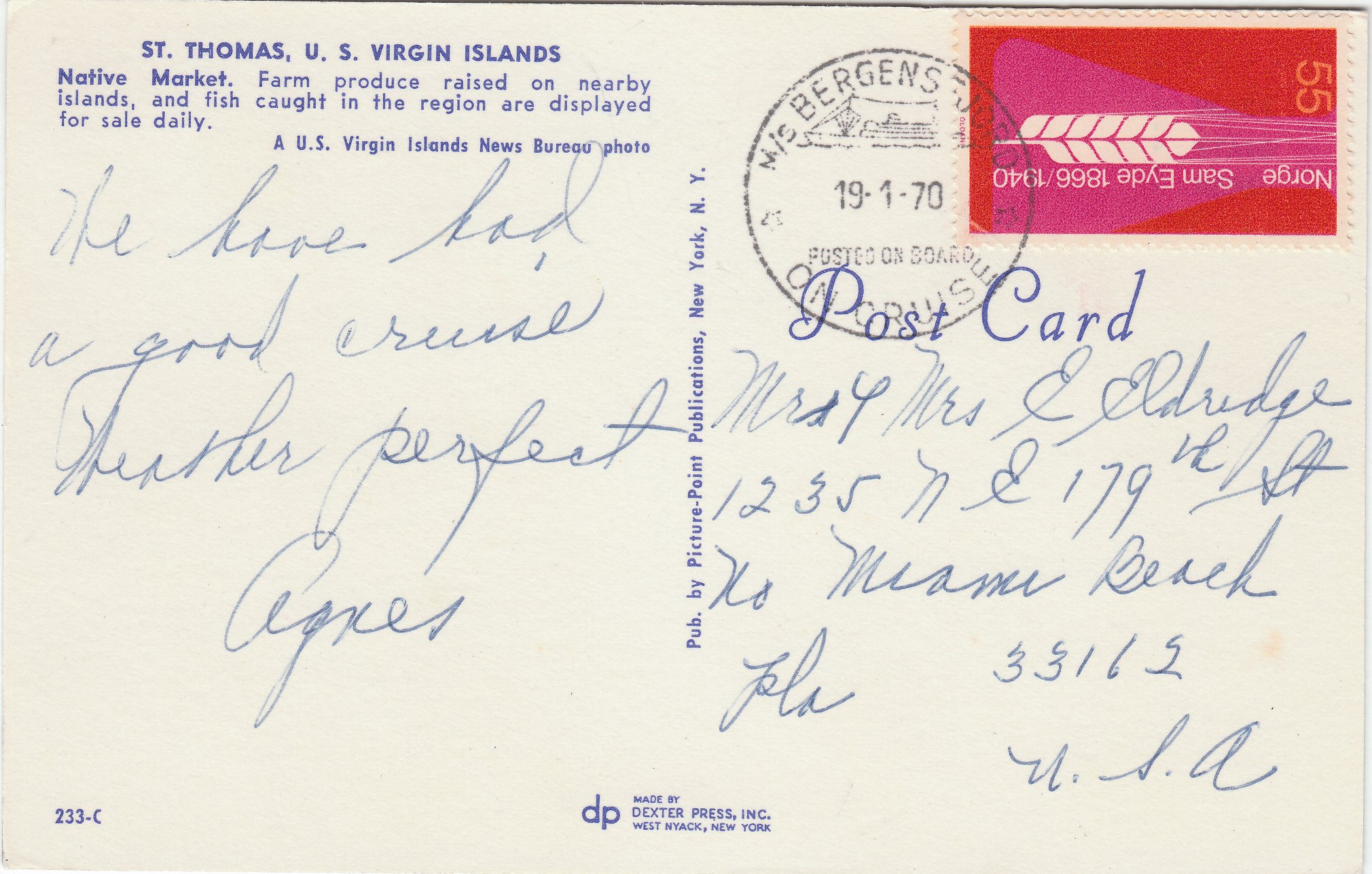 Das norwegische Linienschiff MS BERGENSFJORD verkehrte im transatlantischen Liniendienst zwischen Norwegen und den USA. Diese Postkarte wurde am 19.01.1970 an Bord des Schiffes aufgegeben: