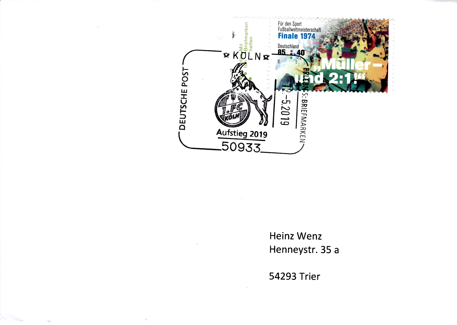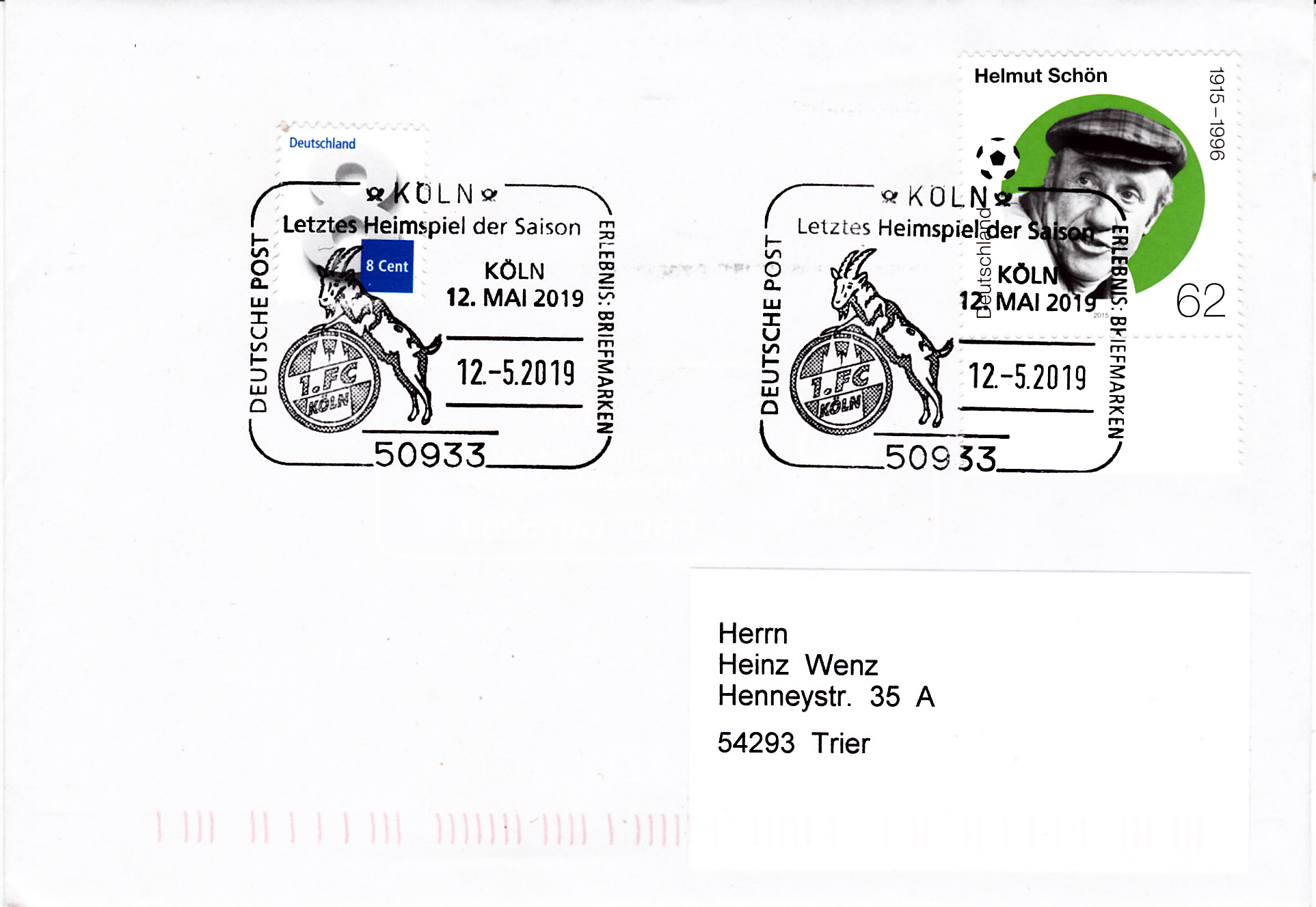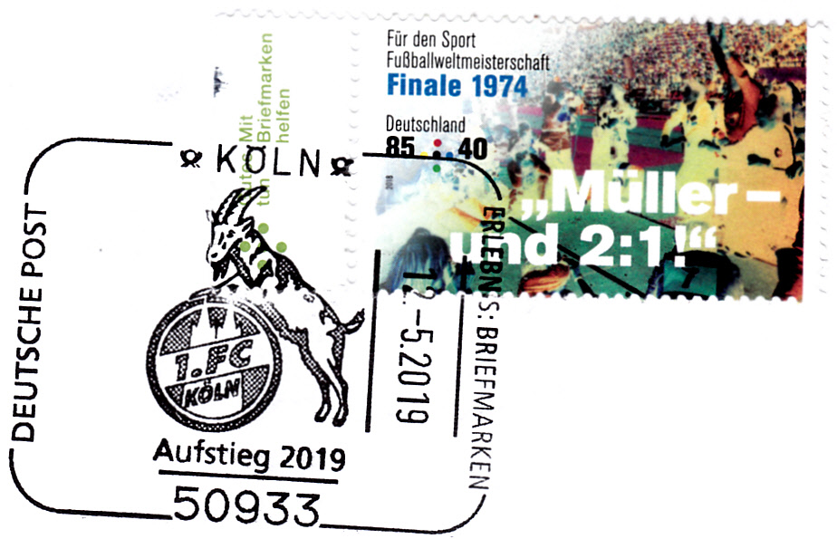 Dieser Sonderstempel vom 12.5.2019 wurde zum letzten Heimspiel des 1.FC Köln in der Spielzeit 2018/2019 eingesetzt. Im Stempelbild wird das Wappen mit Geißbock gezeigt.