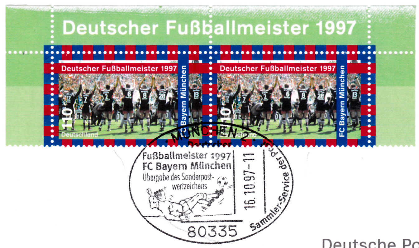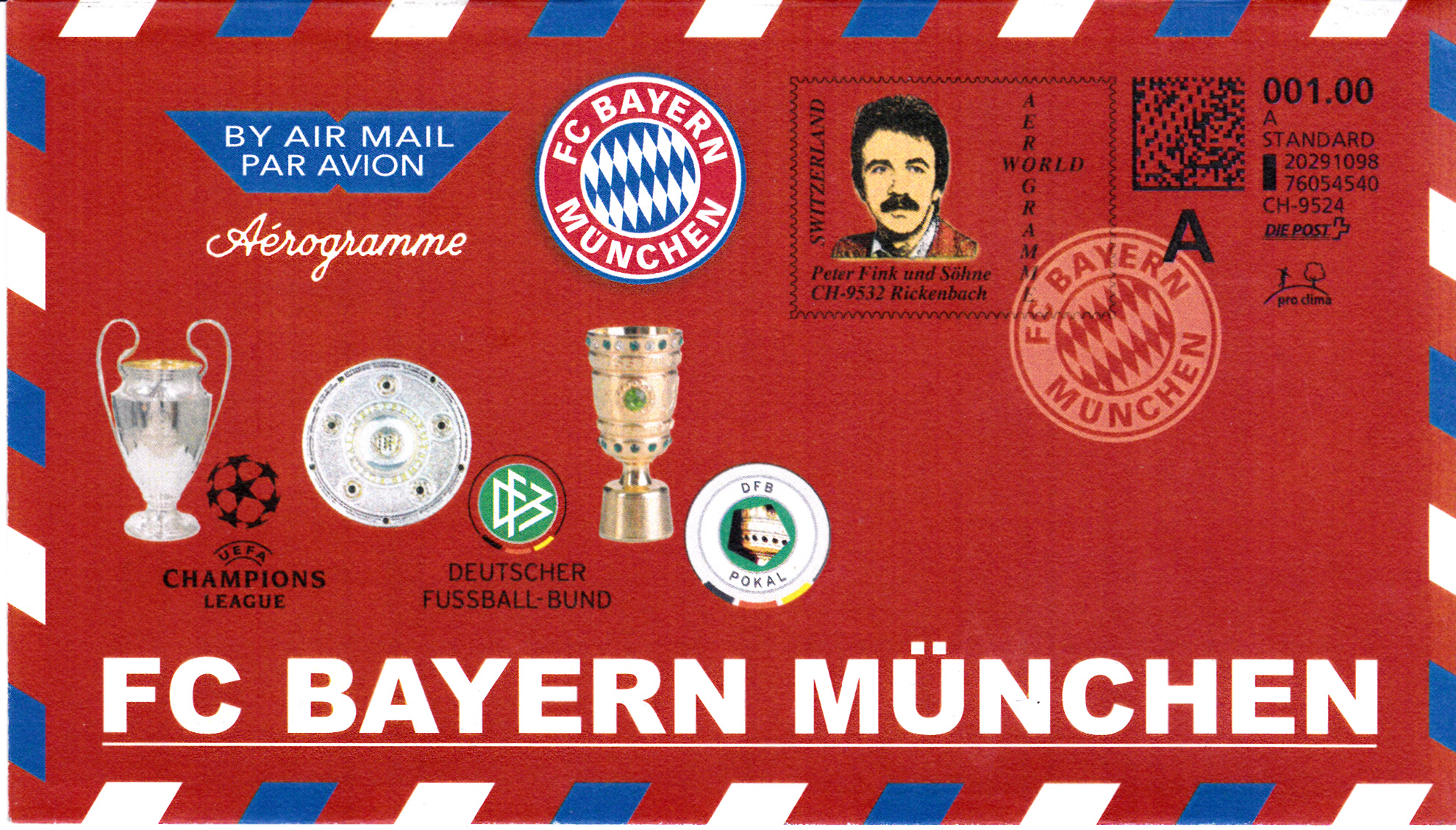 Hier ein mit einer WebStamp bedrucktes Auslands-Aerogramm eines Händlers aus der Schweiz für Aerogramme. Die Werbefläche der WebStamp hat er für Werbung für seine Firma benutzt. Dazu kommt ein privater Zudruck auf dem Aerogramm zum 2:1-Sieg des FC Bayern München gegen Borussia Dortmund beim Champions League Endspiel im Wembley Stadion.
