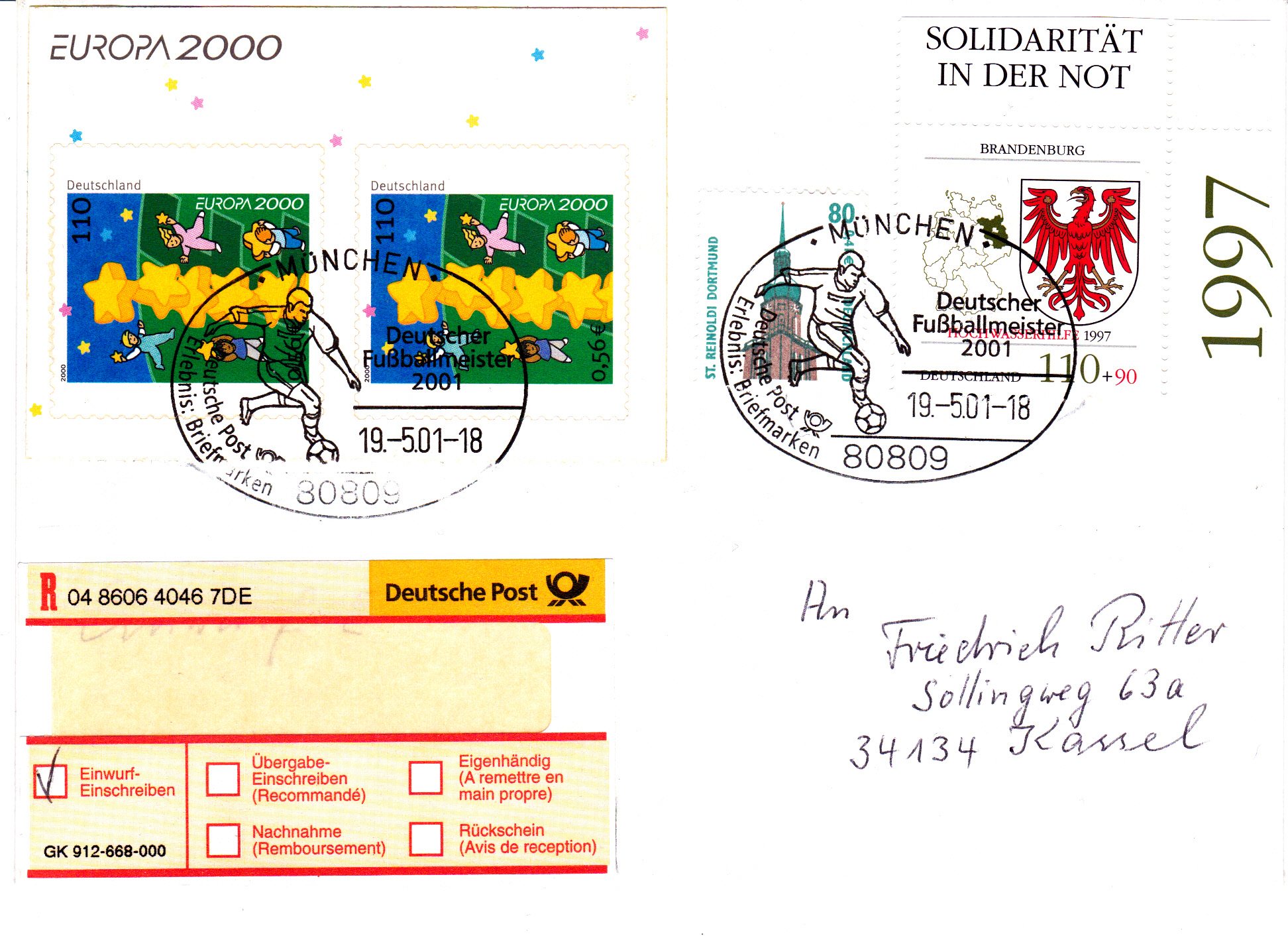 Bayern München wurde in der Saison 2000/2001 Deutscher Meister. Hier der Sonderstempel aus 80809 München zum Gewinn der Deutschen Meisterschaft 2001 auf einem portogerechten Einwurfeinschreiben. Das Porto betrug für einen Brief bis 20 Gramm 110 Pf + Gebühr für Einwurfeinschreiben 300 Pf, insgesamt also 410 Pf.