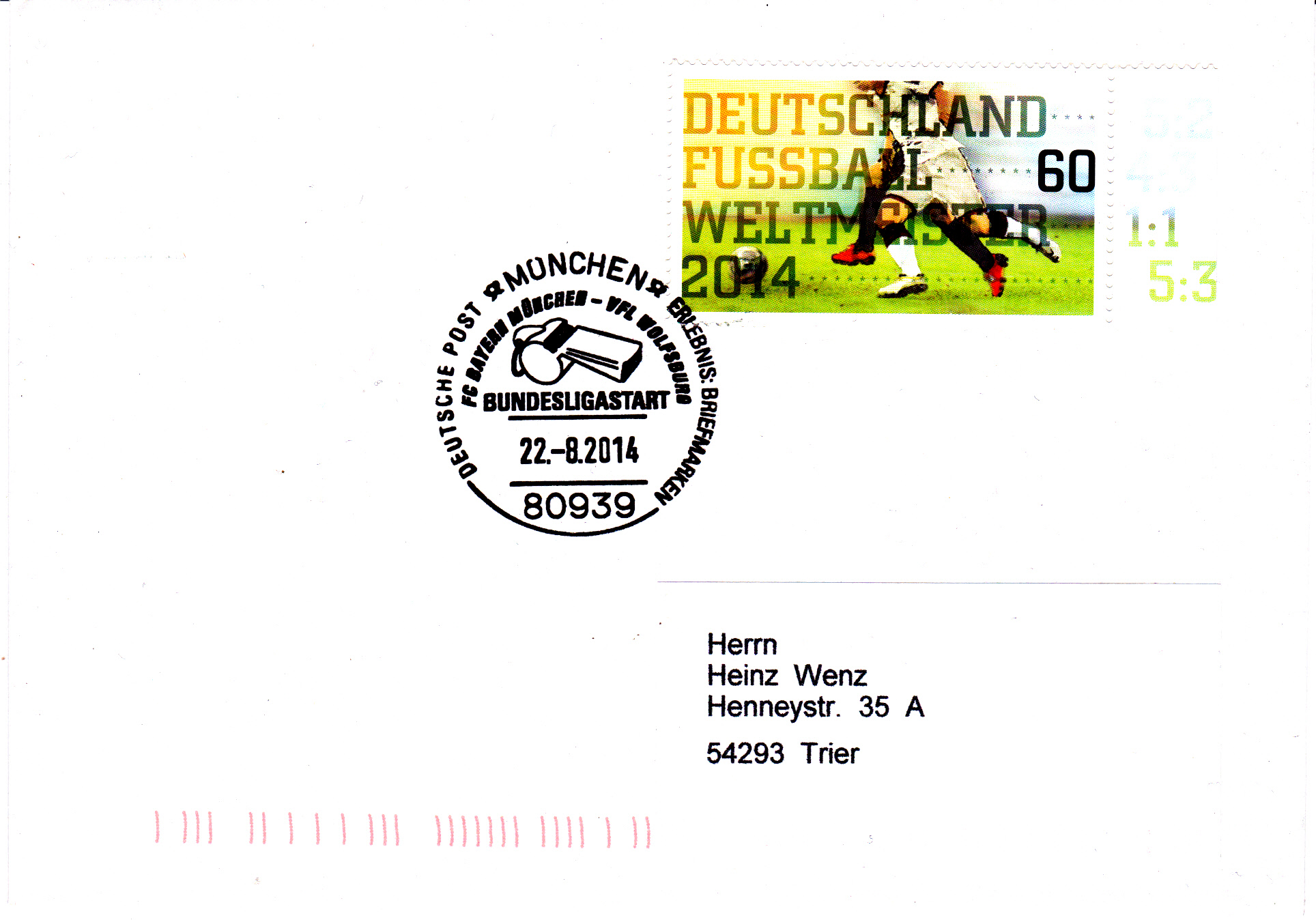 Am 22.8.2014 startete die Bundesligasaison 2014/2015 mit dem Spiel FC Bayern München gegen VFL Wolfsburg. Dazu gab es einen Sonderstempel in 80939 München.