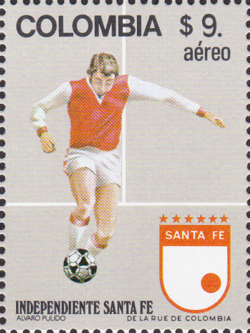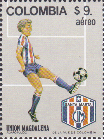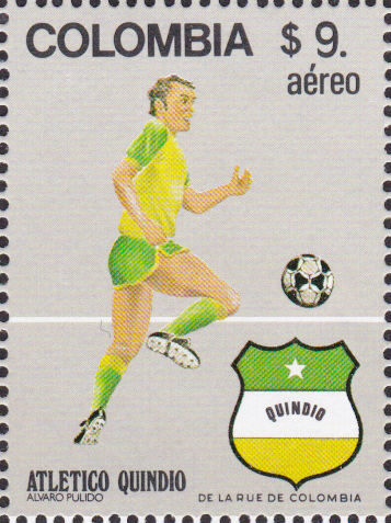 Zu den Fußballweltmeisterschaftenn 1982 in Spanien ist in Kolumbien diese Marke (MiNr 1574) mit einem Spieler und dem Wappen von Atlético Quindío erschienen.