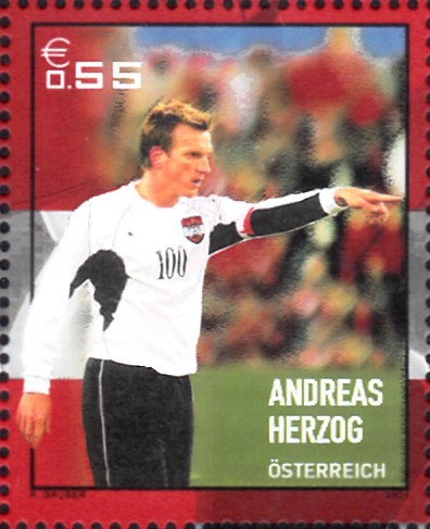 Auf dieser Marke aus Österreich (MiNr 2468) sehen wir Andreas Herzog.