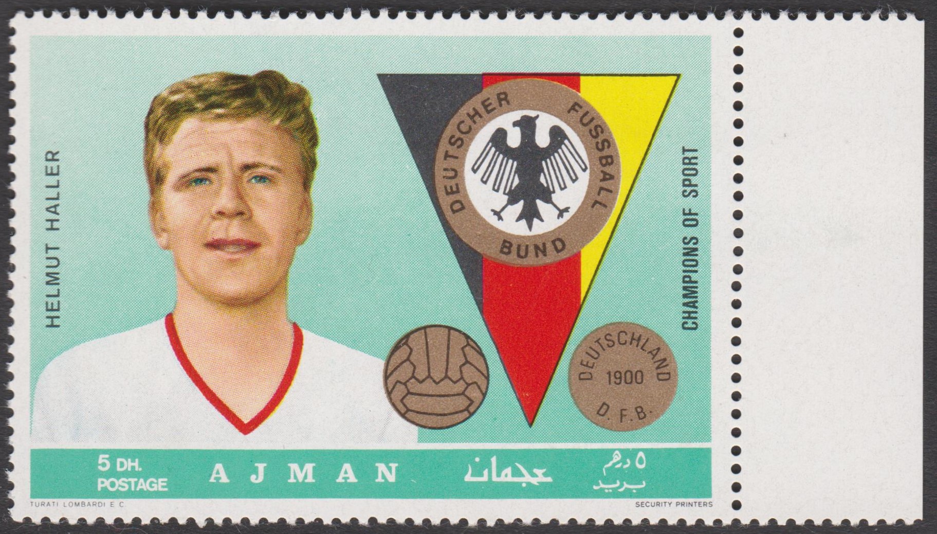 Dieses Postwertzeichen Ajman MiNr. 362 A zeigt Helmut Haller: