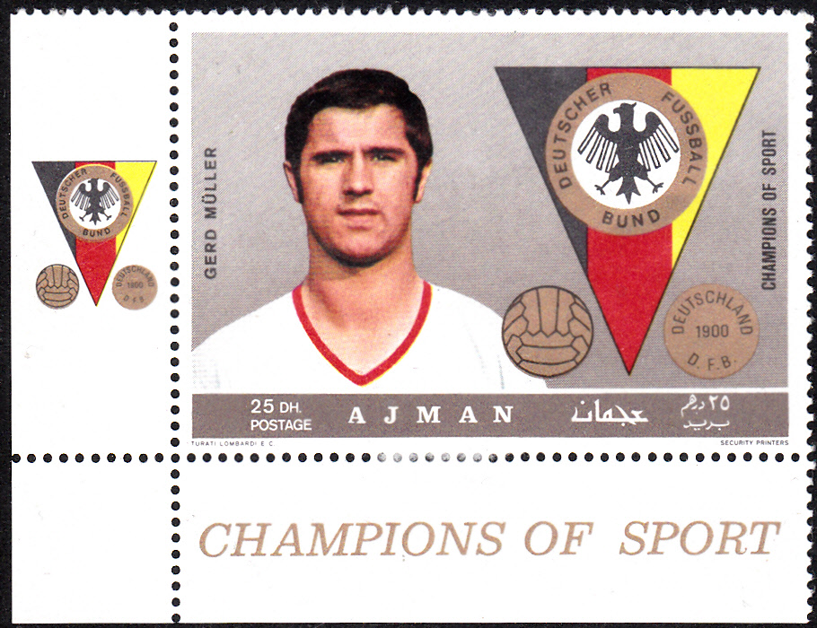 In Ajman erschien in einer Serie mit deutschen Fußballspielern auch eine Marke für Gerd Müller (MiNr 366 A).