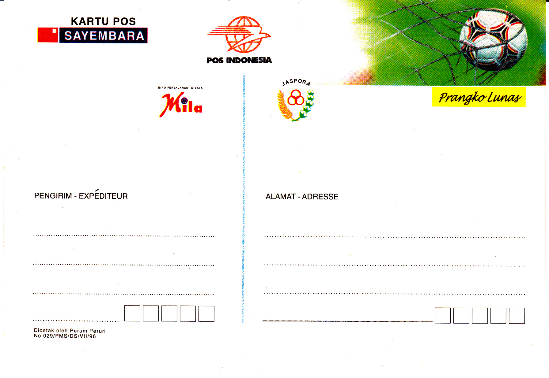 Diese Ganzsachenpostkarte aus Indonesien zeigt einen Ball im "Wertstempel" der Ganzsache. Der Eindruck "Prangko Lunas" bedeutet übersetzt "portofrei", heißt also bereits freigemacht. Das Muster des Balles ähnelt dem der Weltmeisterschaftsbälle "Tango".