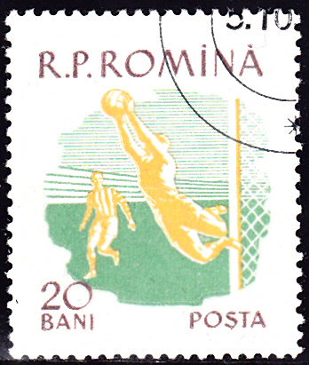 Der Torwart auf dieser Marke aus Rumänien (MiNr 1802) fängt einen Ball sicher mit beiden Händen.