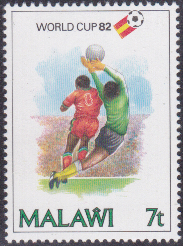 Aus einer Serie aus Malawi kommt diese Marke (MiNr 380) mit einem Torwart, der vor einem Stürmer einen Ball fängt.
