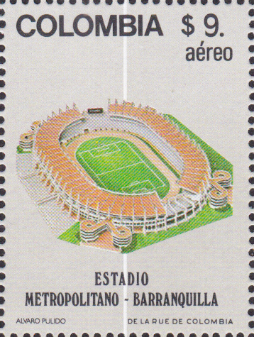Zu den Fußballweltmeisterschaftenn1982 in Spanien ist in Kolumbien diese Marke (MiNr 1569) mit dem Estadio Metropolitano Roberto Meléndez in Barranquilla erschienen.