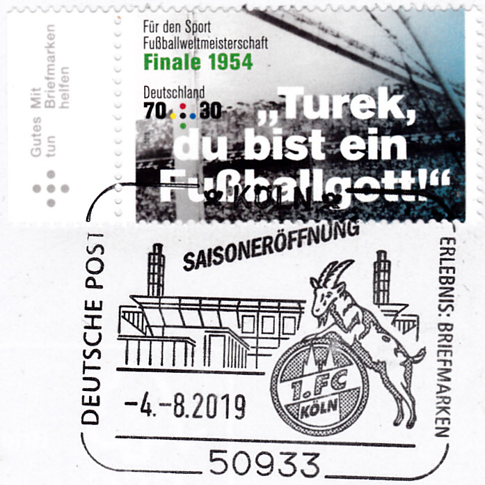 Im Sonderstempel zur Eröffnung der Bundesligasaison 2019/20 wurde am 4.8.2019 wird der Eingang zum RheinEnergieSTADION gezeigt.
