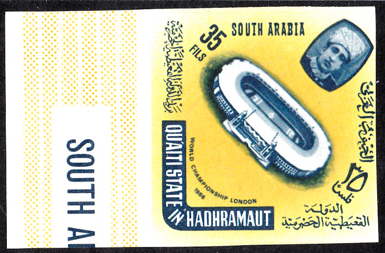 Auf dem Wert zu 10 Fils aus der Serie (MiNr 72A) zu den Fußballweltmeisterschaften 1966 in England aus Aden, Qu'aiti State in Hadhramaut (einem Teilstaat des britischen Protektorats von Südarabien) wird auch das Wembley-Stadion gezeigt.