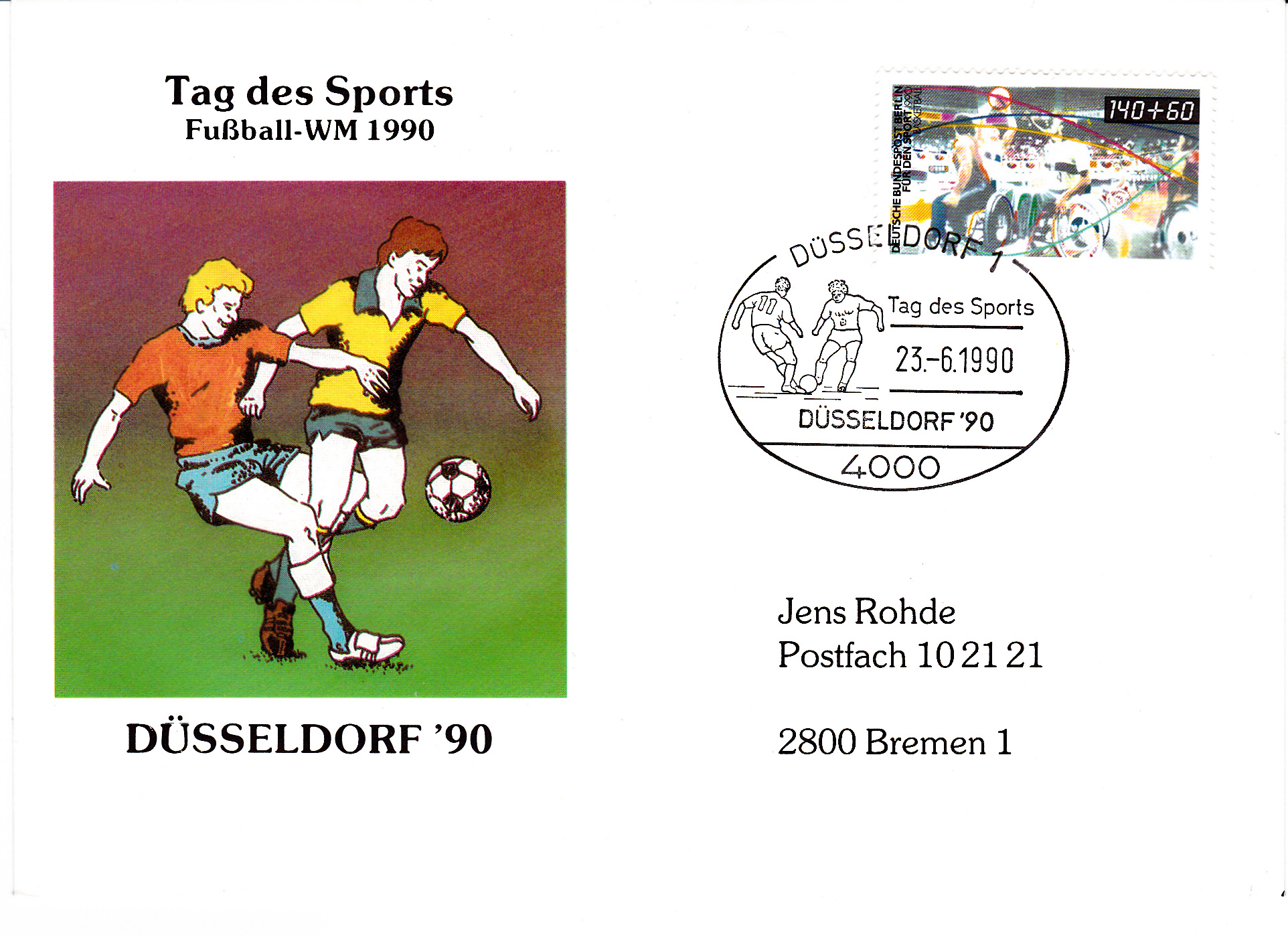 Sonderstempel zum Tag des Sports bei der Weltausstellung der Jungen Briefmarkenfreunde Düsseldorf'90. Im Stempelbild ist eine Spielszene beim Fußball zu sehen.