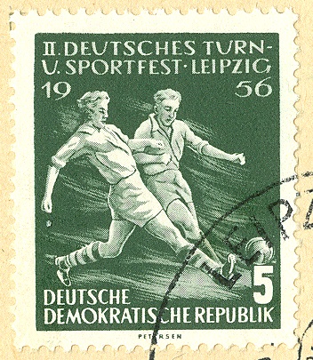 Die MiNr. 530 der DDR-Ausgabe vom 25.Juli 1956 zeigt eine klassische Spielszene: den sportlichen Kampf zweier Feldspieler um das Sportgerät "Fußball".
