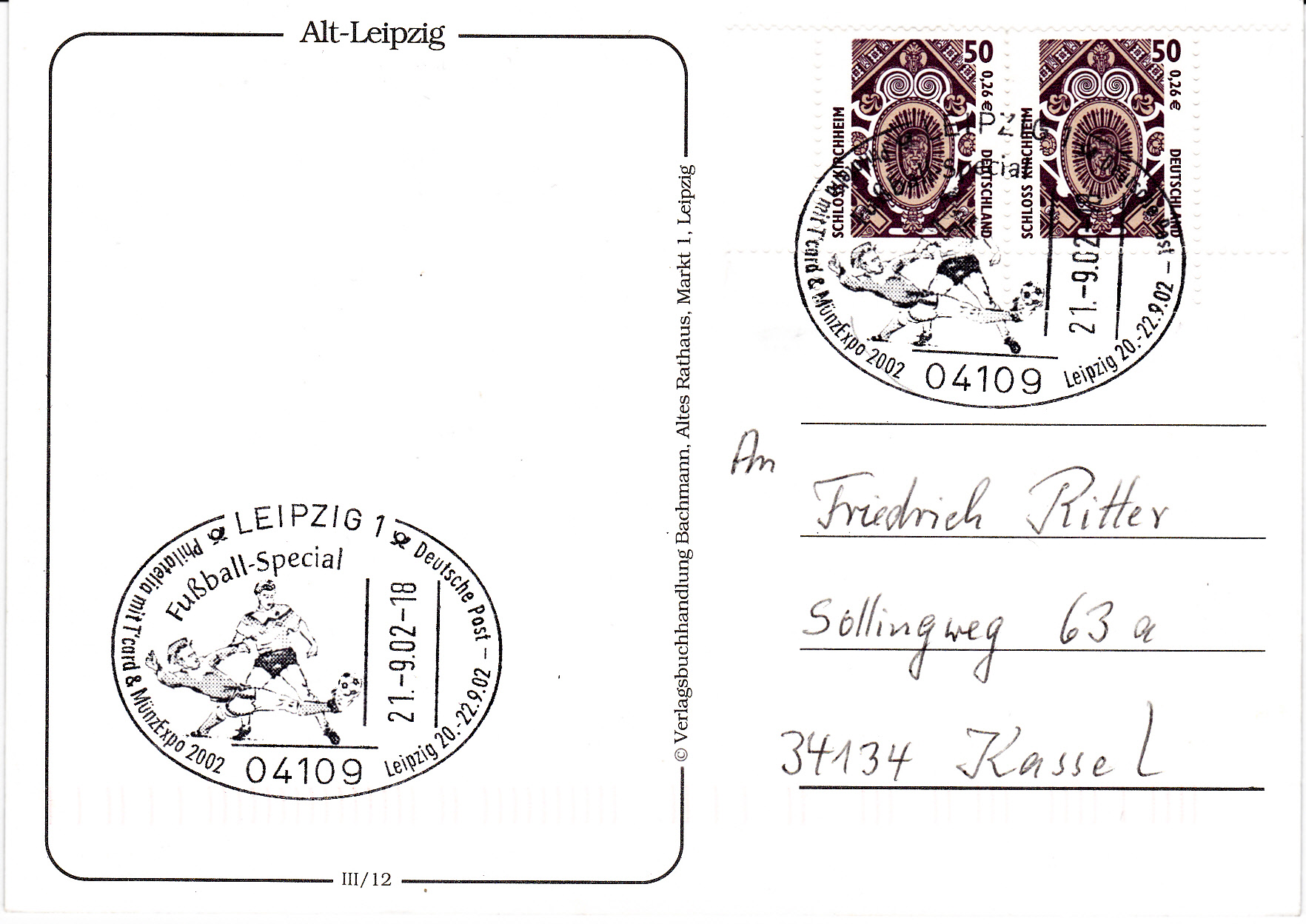 Der Sonderstempel zur Philatelia 2002 in Leipzig vom 21.9.2002 zeigt einen Zweikampf um den Ball.