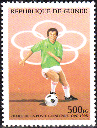 Auf dieser Marke aus Guinea (MiNr 1525) zu den Olympischen Sommerspiele 1996 in Atlanta wird ein Fußballspieler bei Führen eines Balles gezeigt.