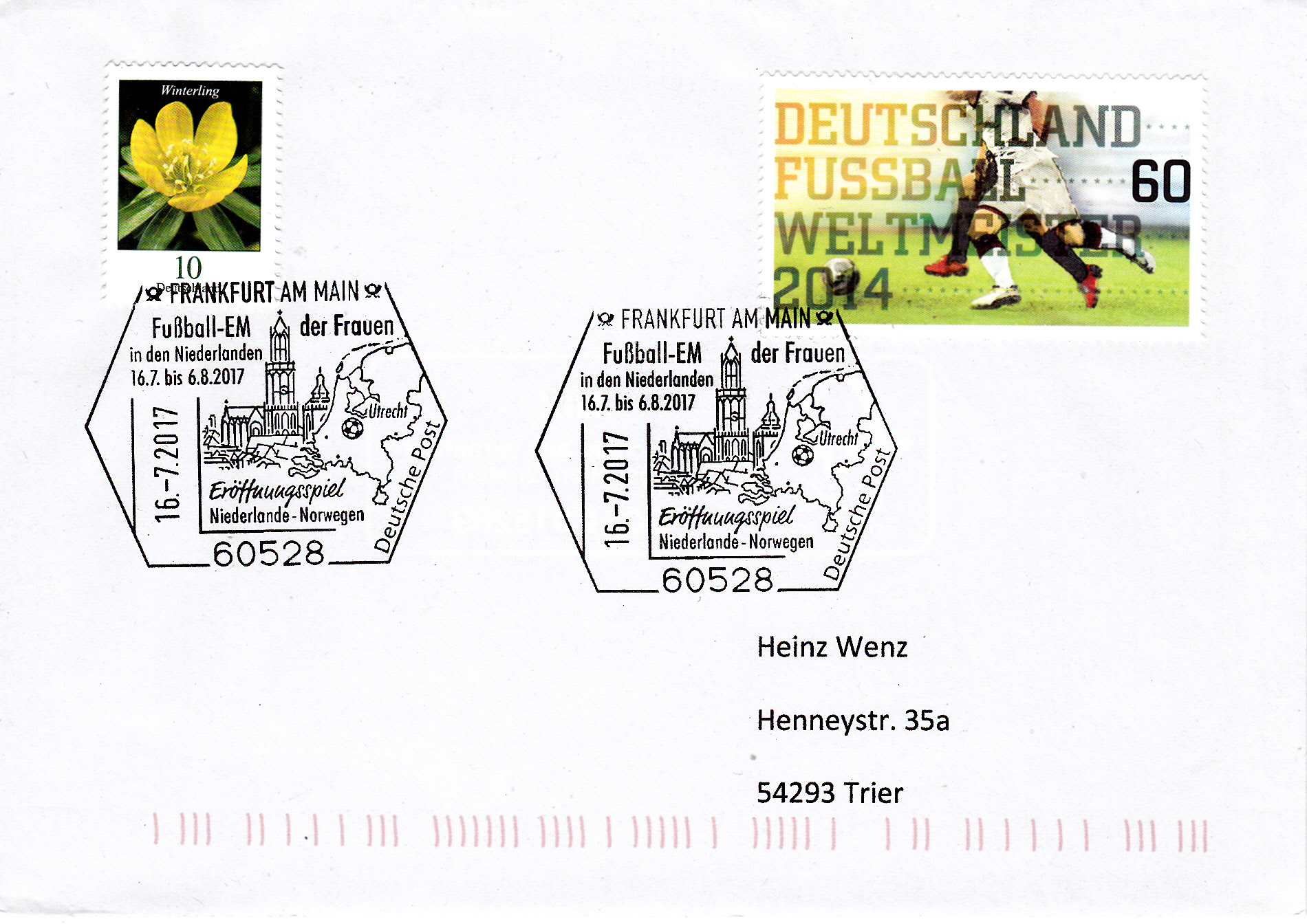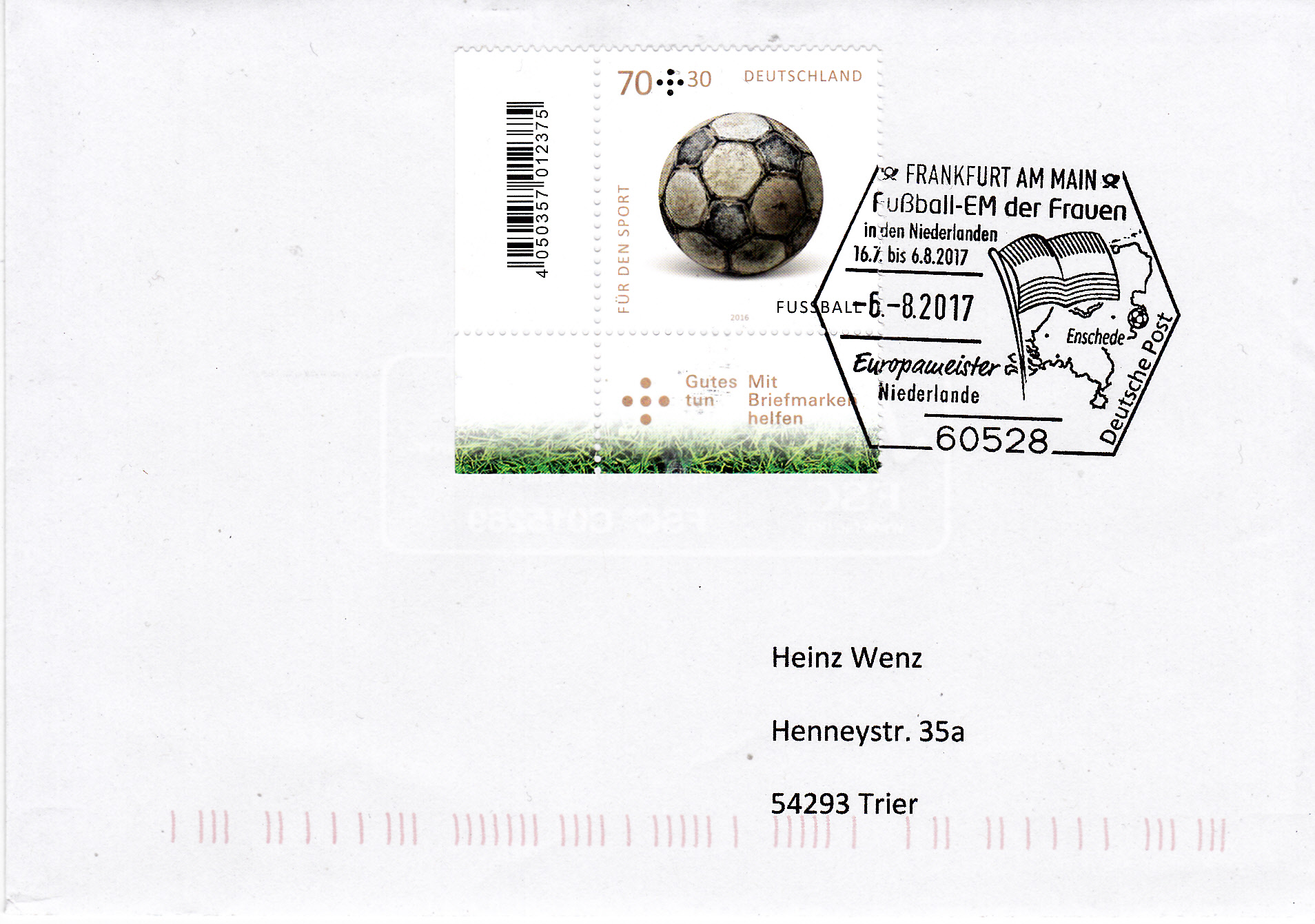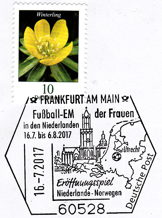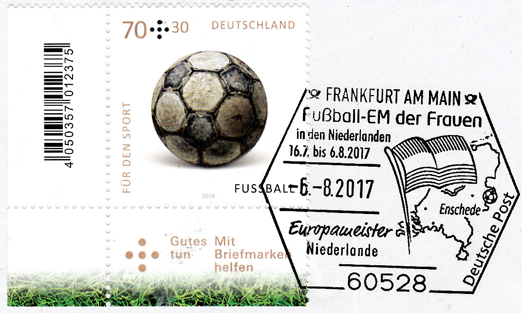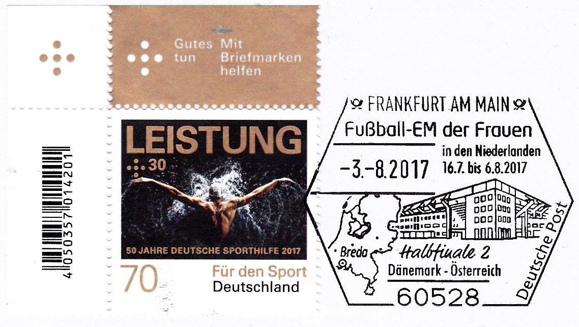 Der Sonderstempel vom 3.8..2017 aus Frankfurt zum Halbfinale Dänemark - Österreich zeigt das Stadion in Breda.