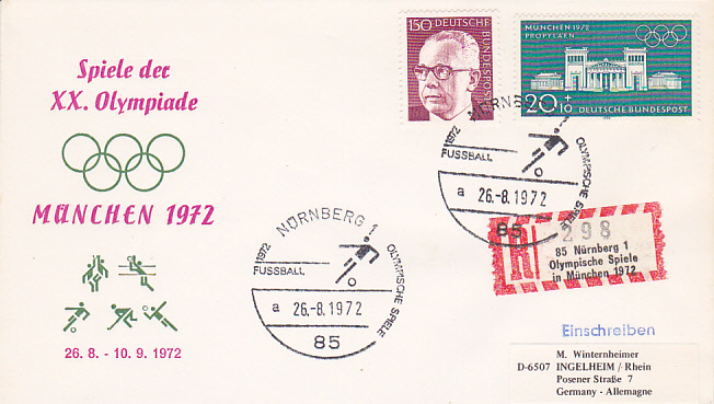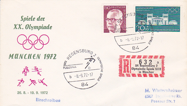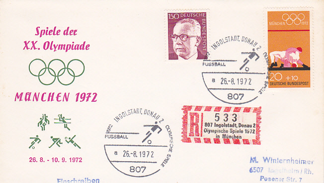 Die Spiele des olympischen Fußballturniers fanden nicht nur in München statt sondern auch in anderen Städten. Hier der Sonderstempel auf einem Einschreibebrief aus Ingolstadt ohne Uhrzeit mit Kennbuchstaben "a" und Sonder-R-Zettel mit dem Zudruck "Olympische Spiele 1972 München".