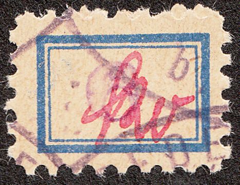 Als zweites Beispiel für eine solche Behelfsmarke folgt hier ein gestempeltes Exemplar der Wertstufe zu "6" Pfennig, MiNr. 51 in der Rahmengröße 14 x 9,5 mm mit großer Wertziffer in bläulichviolett sowie Signum, MiNr. Sp 102 b: