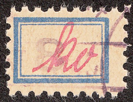 Als drittes Beispiel für eine solche Behelfsmarke folgt hier ein gestempeltes Exemplar der Wertstufe zu "8" Pfennig, MiNr. 52 in der Rahmengröße 14 x 9,5 mm mit großer Wertziffer in blauschwarz sowie Signum, MiNr. Sp 106: