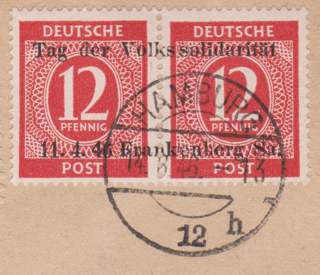In Frankenberg in Sachsen wurden am 11.04.1946 = "Tag der Volkssolidarität" insgesamt 5000 Paare der Wertstufe 12 Pf der Kontrollrat-Gemeinschaftsausgabe "Ziffernserie" mit einem Aufdruck versehen.