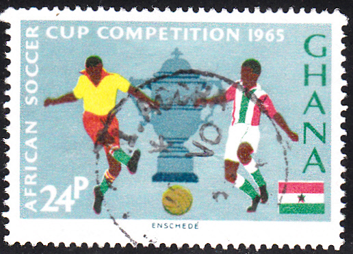 Hier eine Marke aus Ghana (MiNr 245) zur Afrikameisterschaft 1965 im Fußball mit der Abbildung zweier Spieler beim Zweikampf und dem Pokal.