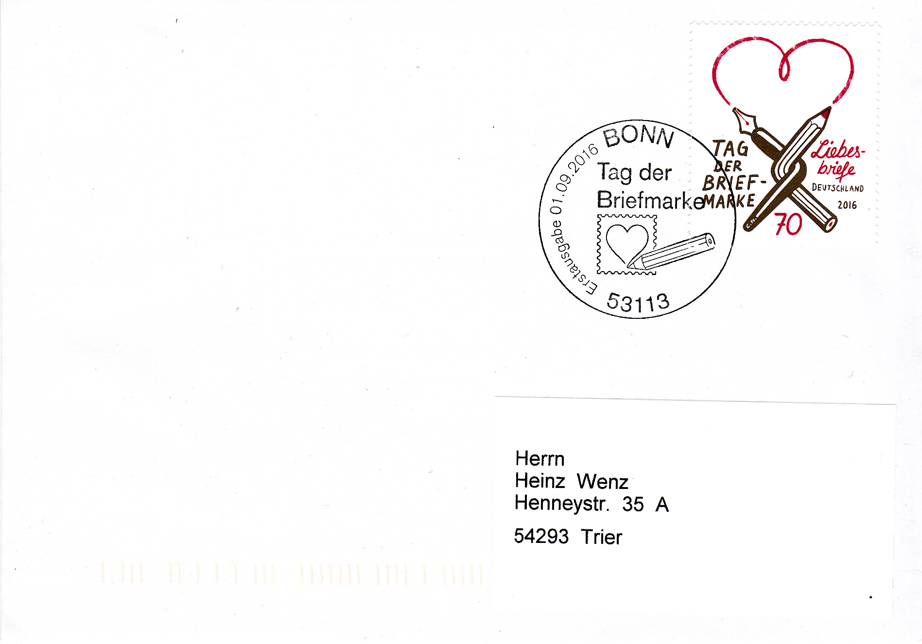 Zum Tag der Briefmarke 2016 erschien bei der Deutschern Post AG am 1.9.2016 eine Marke (MiNr 3259) zum Thema "Liebesbriefe" mit dem Bild "Verschlungener Füllfederhalter mit Buntstift" und einem gezeichneten Herz.