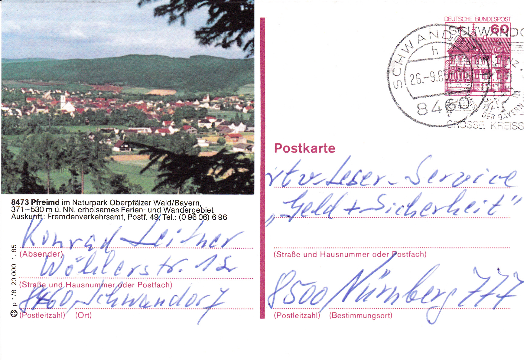 Auf dieser Bildpostkarte aus dem Jahre 1985 wirbt Pfreimd im Naturpark Oberpfälzer Wald für sein "erholsames Ferien- und Wandergebiet".