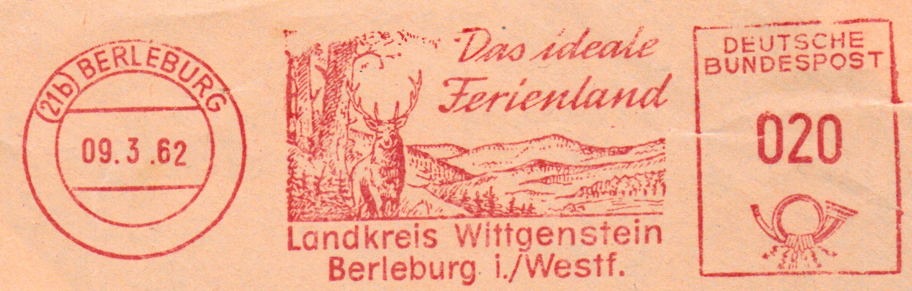 Absenderfreistempel vom 9.3.1962 mit dem Werbeeinsatz "Das ideale Ferienland Landkreis Wittgenstein Berleburg i./Westf."