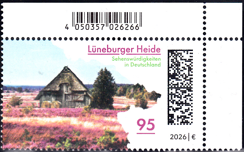 In der Serie "Sehenswürdigkeiten in Deutschland" erschien bei der Deutschen Post eine Marke "Lüneburger Heide" (MiNr 3962). Hier zeige ich eine Marke vom Eckrand mit EAN-Codierung.