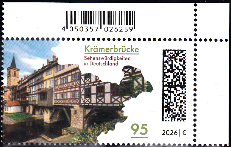 In der Serie "Sehenswürdigkeiten in Deutschland" erschien bei der Deutschen Post eine Marke "Krämerbrücke" (MiNr 3961) mit der Krämerbrücke in Erfurt und in einer Umrisskarte Thüringens. Hier zeige ich eine Marke vom Eckrand mit EAN-Codierung.