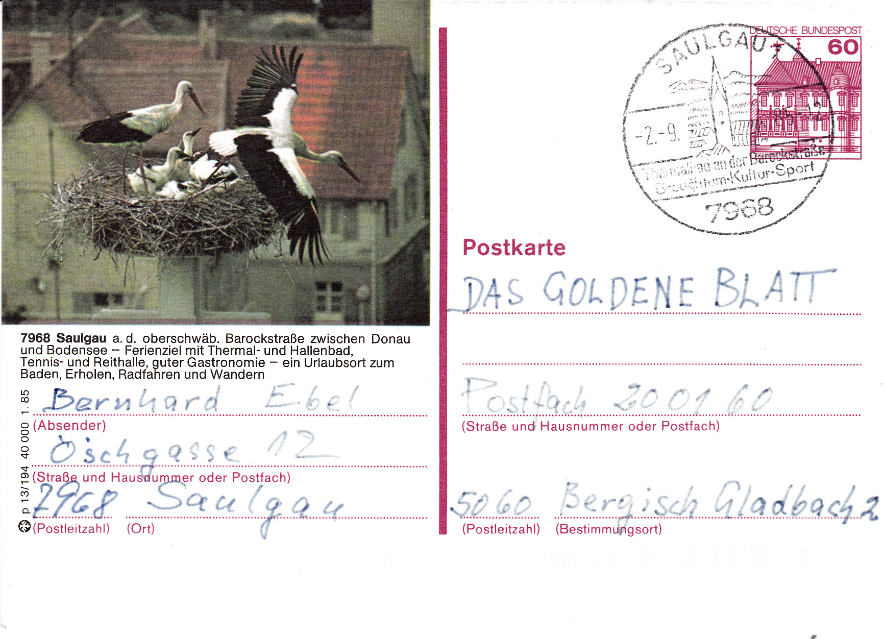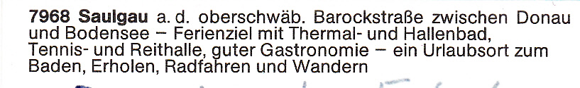 Bildpostkarte aus dem Jahre 1985 mit Werbung für Saulgau. In Saulgau sind zahlreiche Historische Gebäude in der Altstadt zu besichtigen.