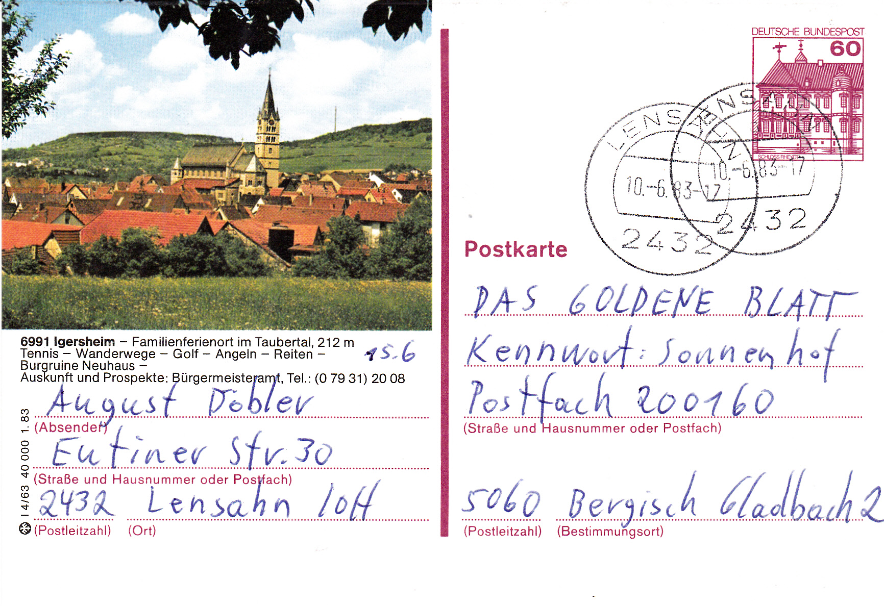 Auf einer Bildpostkarte aus dem Jahre 1983 wird für Igersheim mit dem gleichen Text aber einem anderen Bild geworben.