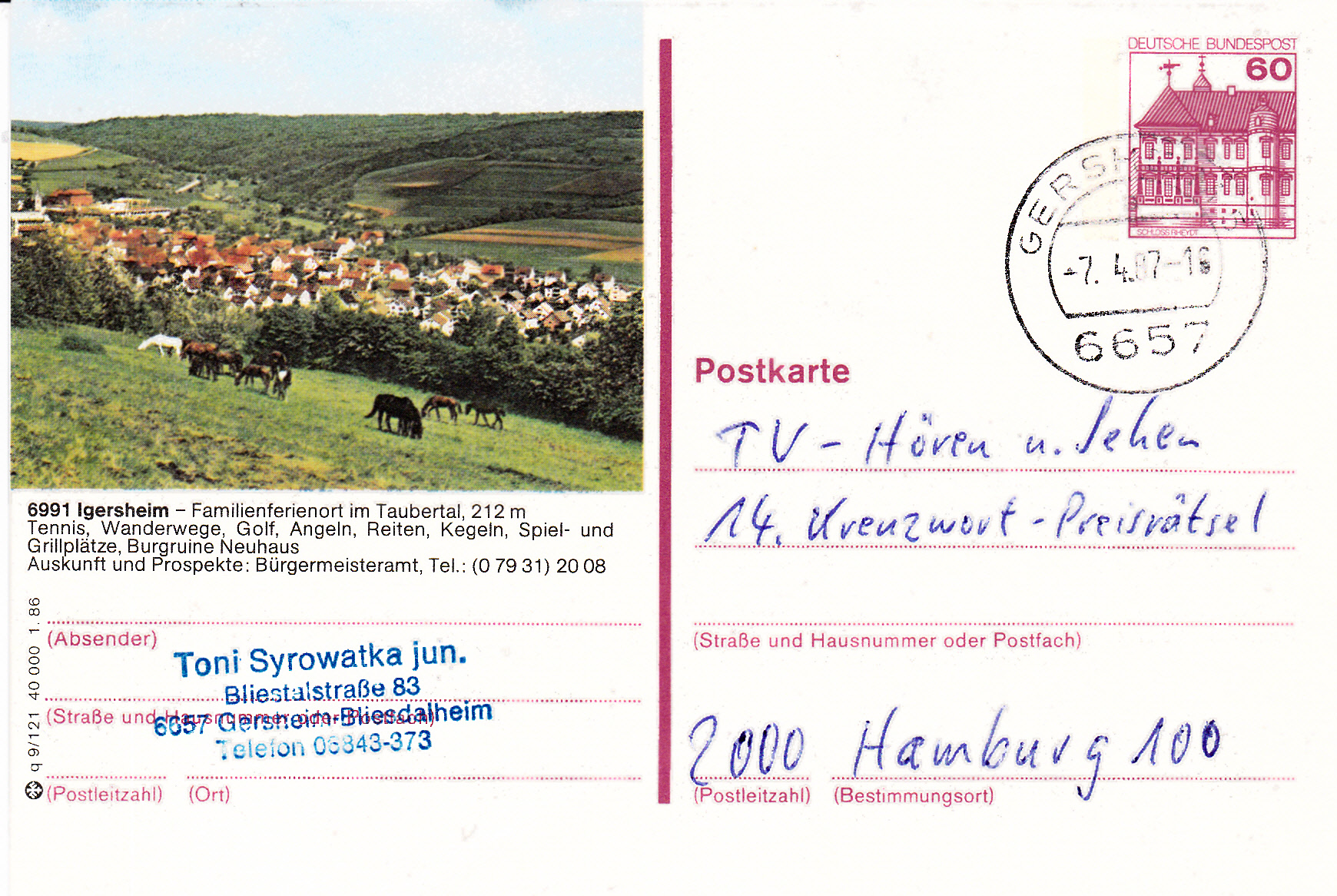 Hier eine weitere Bildpostkarte mit Werbung für Igersheim. Sie stammt aus dem Jahre 1986. Wie man im leicht veränderten Text der Karte liest, sind inzwischen weitere Möglichkeiten der Ferienbeschäftigung hinzugekommen: Kegeln sowie Spiel- und Grillplätze.