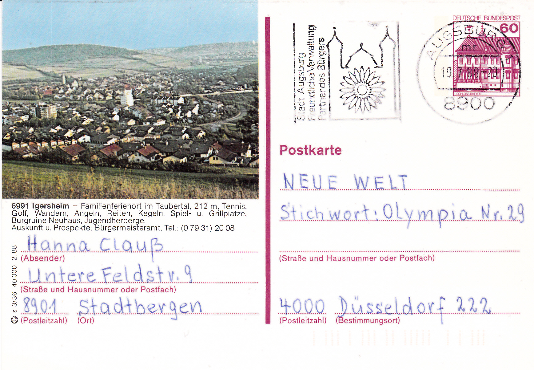 Noch eine Bildpostkarte als Werbung für Igersheim, jetzt aus dem Jahre 1988. Beim Text wird jetzt auch eine Jugendherberge erwähnt, die vermutlich in den Jahren davor neu eingerichtet wurde.