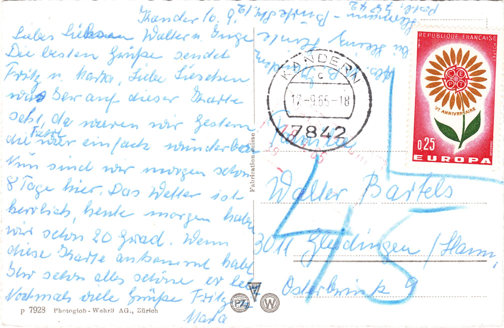 Die Sendung ist als Postkarte nach 3011 Gleidingen adressiert, lief also innerhalb der Bundesrepublik Deutschland und kostete als Postkarte in Fernverkehr im Jahr 1965 ein Porto von 15 Pfennig.