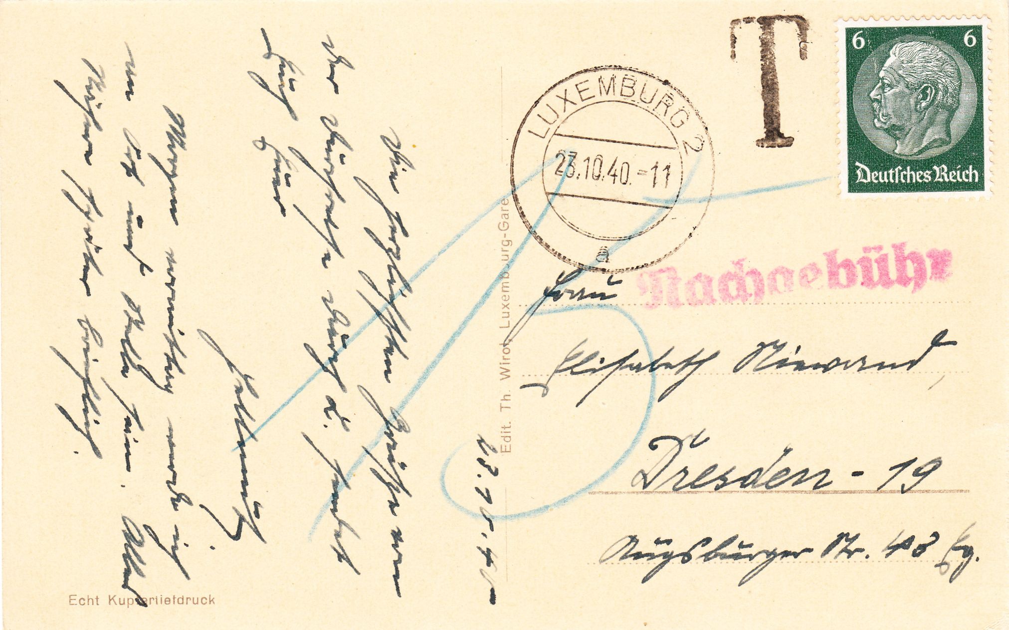 Für eine Postkarte aus dem besetzten Luxemburg galt statt der sonst für eine Postkarte ins Ausland geltenden 15 Pfennig als Sondertarif eine Portostufe in Höhe von 10 Pfennig.