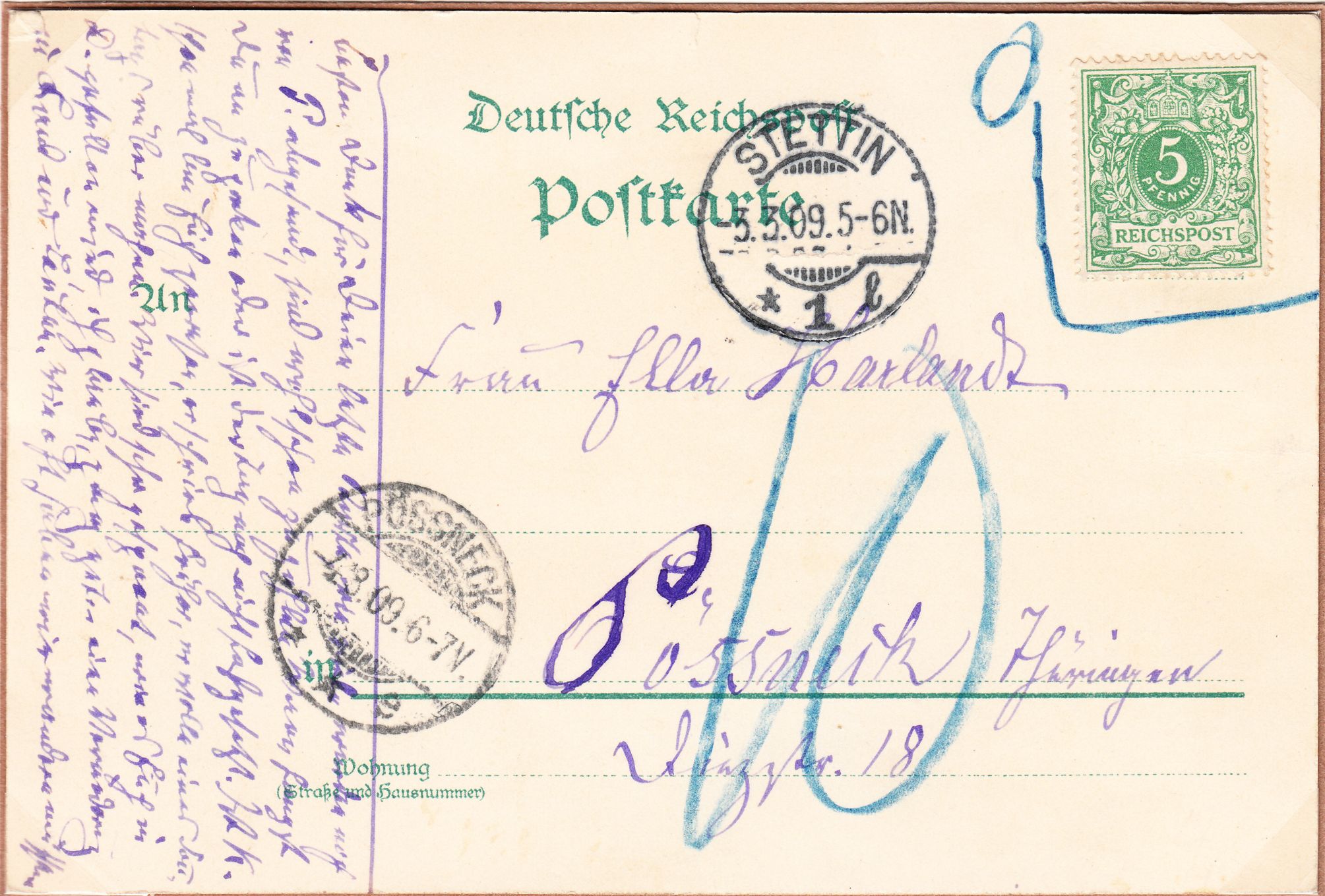 Dieser Umstand wurde durch Umrahmung des Postwertzeichens in Blaustift dokumentiert und der Tagesstempel "STETTIN 3.3.09.5-6N." wurde daneben gesetzt.