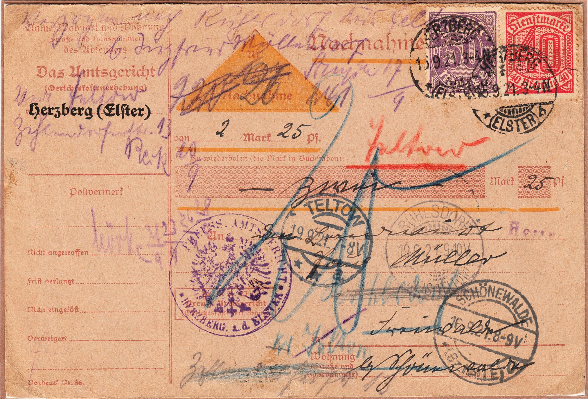 Dieser am 15.09.1921 in HERZBERG (ELSTER) vom dortigen Amtsgericht aufgegebene Beleg wurde entsprechend einer Postkarte im Fernverkehr (40 Pfennig), per Nachnahme (50 Pfennig), portorichtig mit Dienstmarken freigemacht: